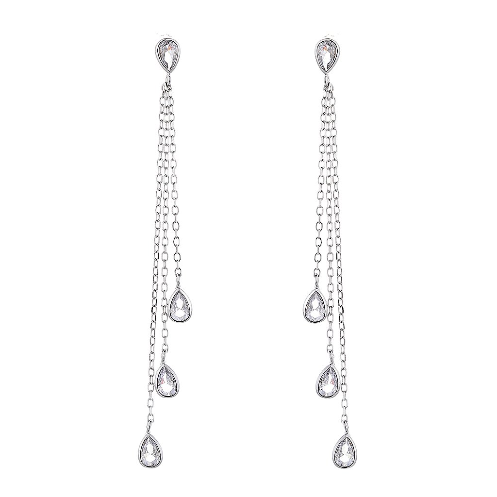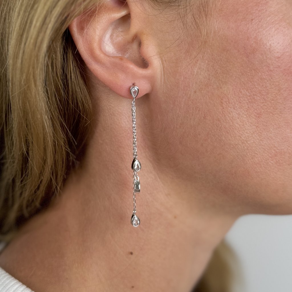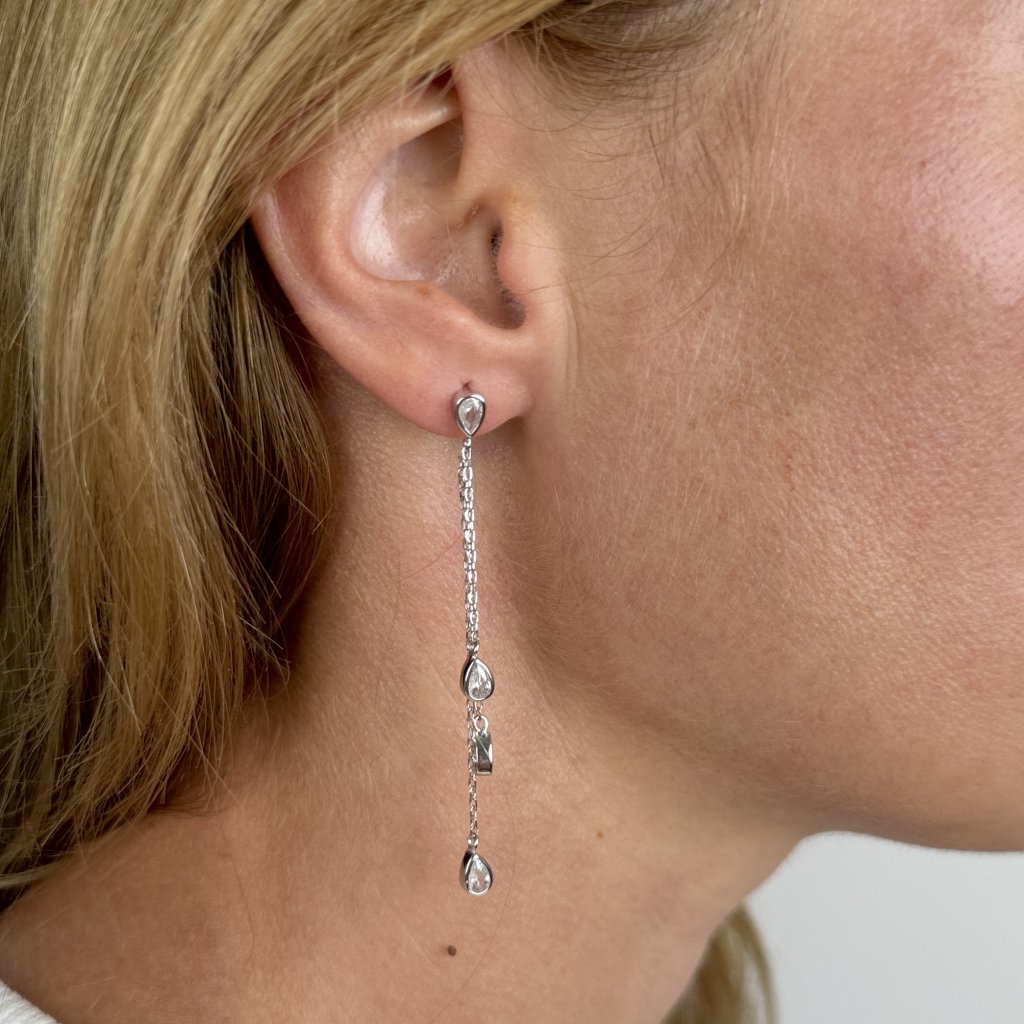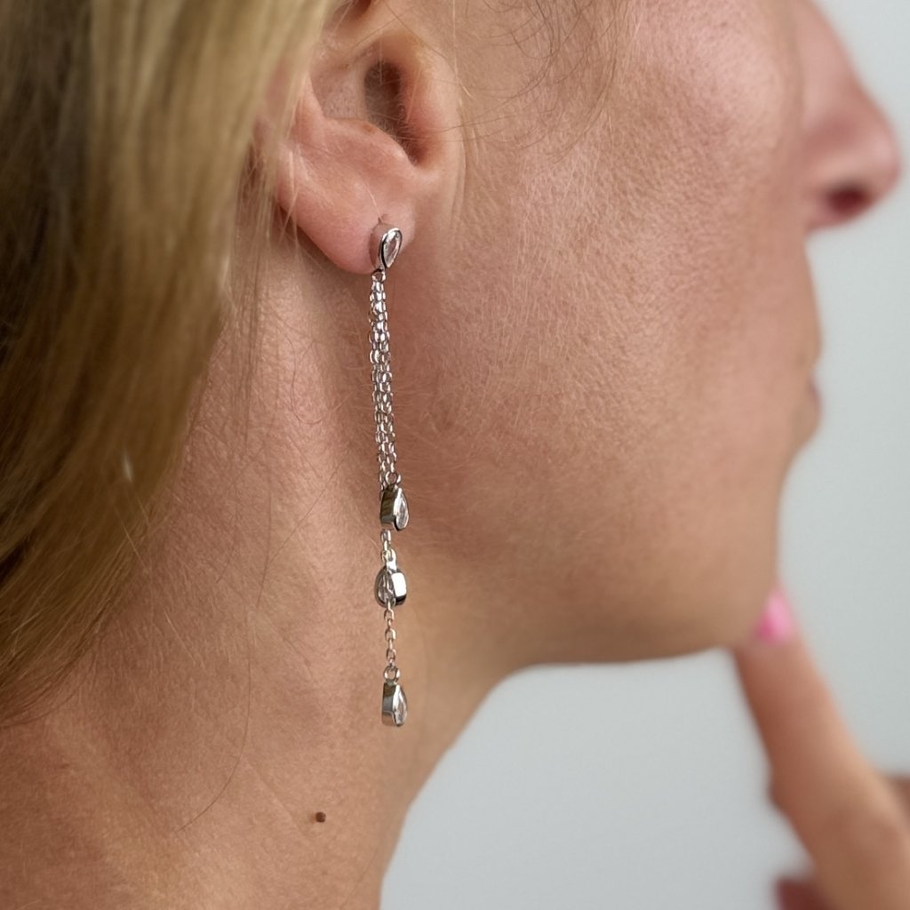 Strieborné náušnice BREE sú stelesnením elegancie a jemnosti. Tieto náušnice sú vyrobené z kvalitného striebra 925 s ródiovanou povrchovou úpravou a majú jedinečný dizajn troch visiacich retiazok, z ktorých každá je ukončená trblietavým zirkónom v tvare kvapky.