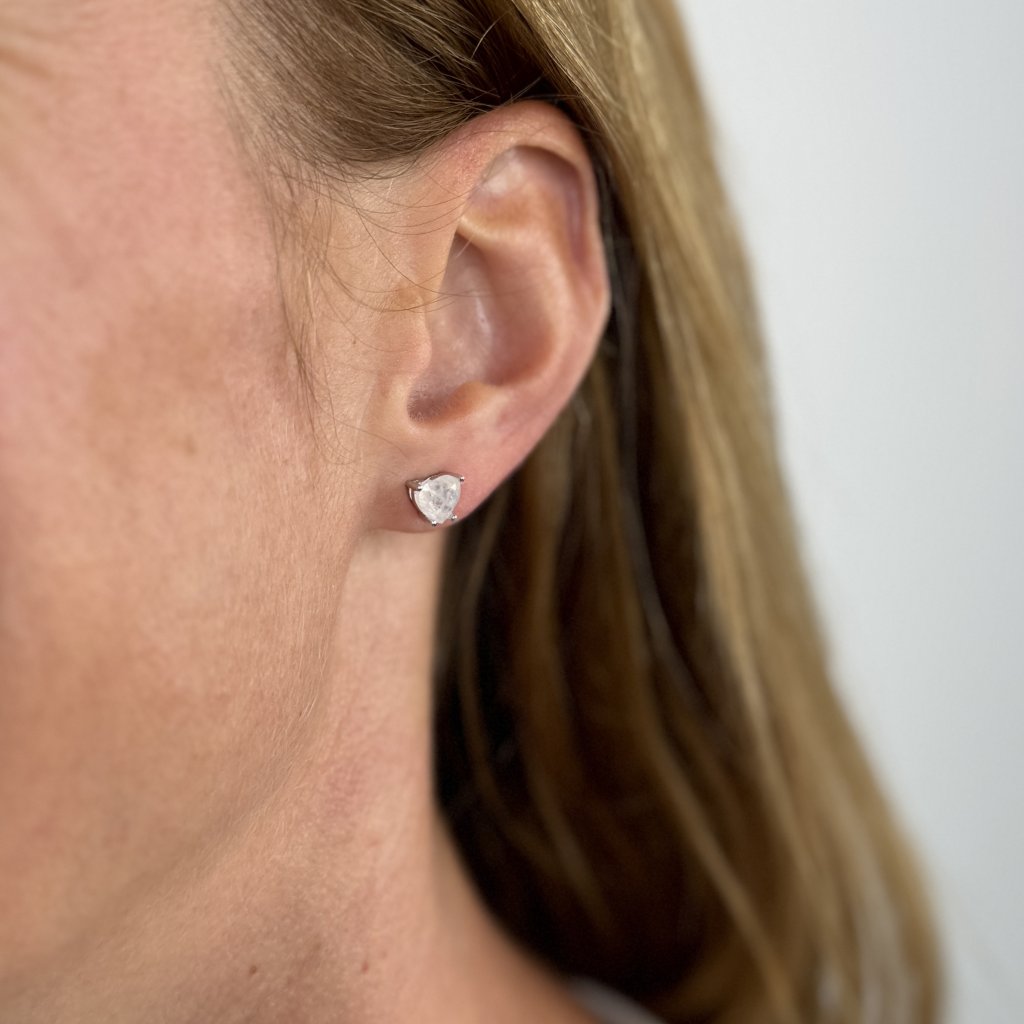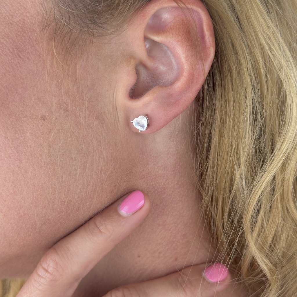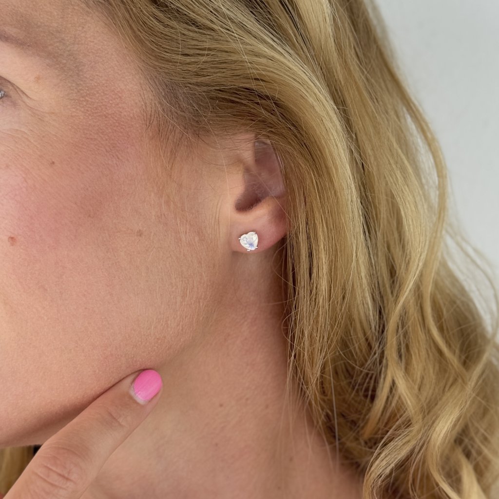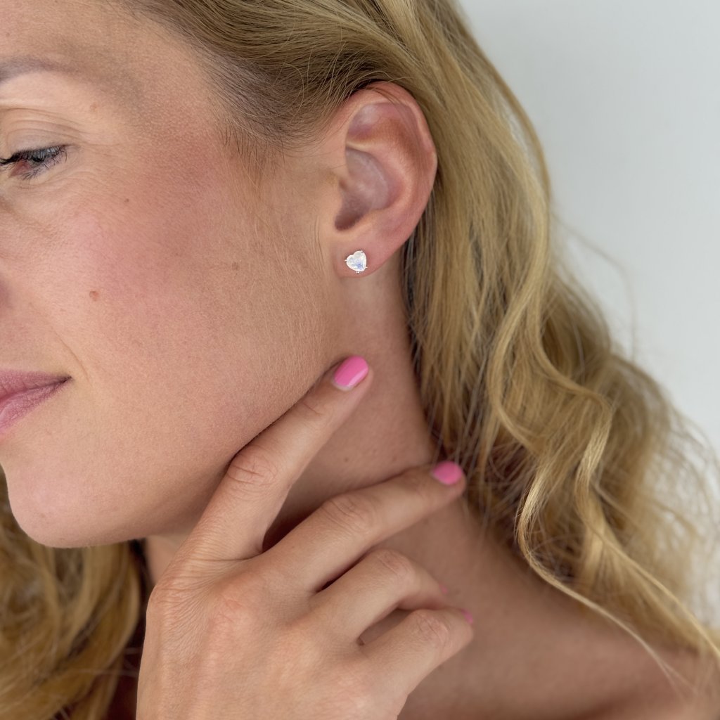 Strieborné náušnice ROSA sú stelesnením jemnosti a elegancie. Tieto náušnice v tvare srdca sú vyrobené z kvalitného rhodiovaného striebra 925 a zdobí ich nádherný syntetický mesačný kameň, ktorý im dodáva perleťový lesk a jemnú bielu farbu.