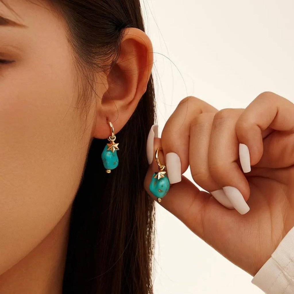 Kruhová časť náušníc má priemer 10 mm, čo je ideálna veľkosť na pohodlné celodenné nosenie. Tyrkysová hviezda s rozmermi 9 × 12 mm dodáva náušniciam jedinečný nádych a jemne sa pohupuje pri každom pohybe.
