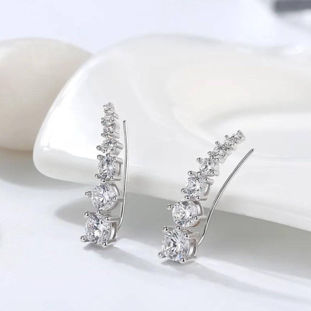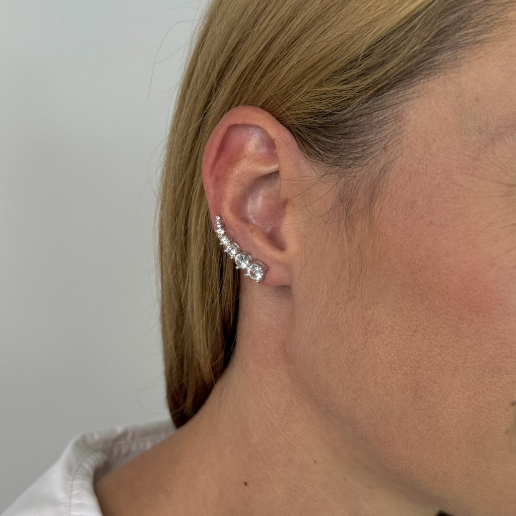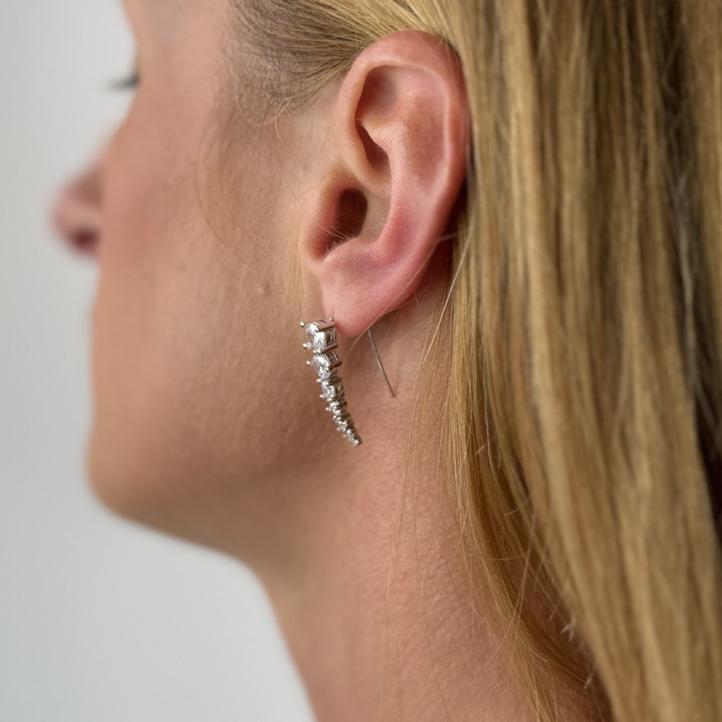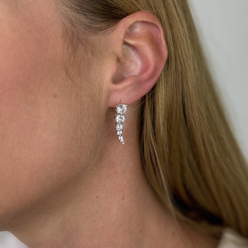Náušnice sú osadené trblietavými zirkónmi, ktoré im dodávajú iskru a luxusný nádych. Vďaka dĺžke 27 mm a šírke 5 mm sú náušnice dostatočne výrazné a nepôsobia prehnane.