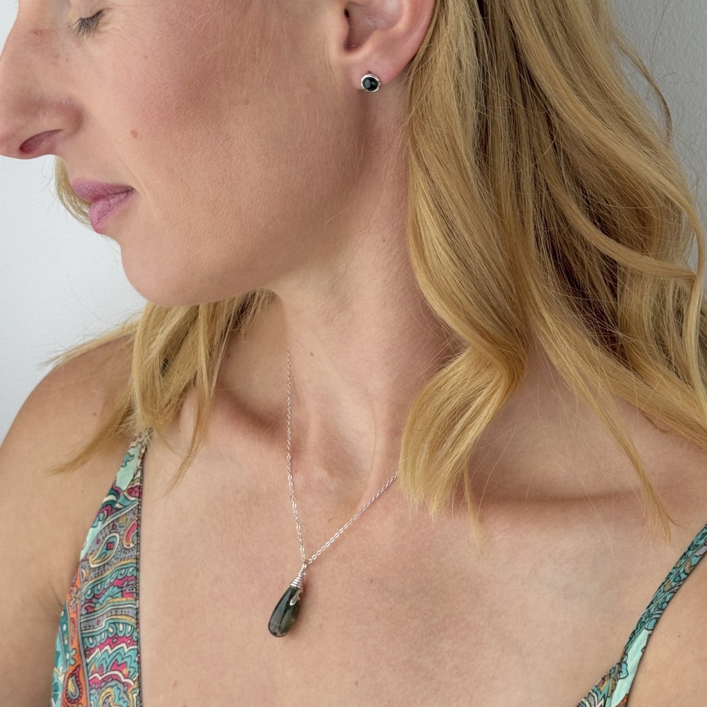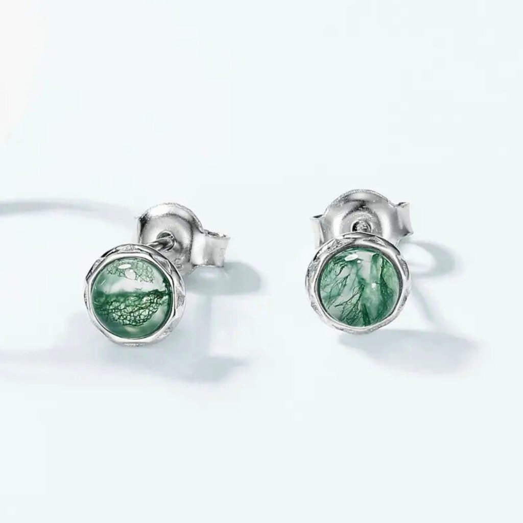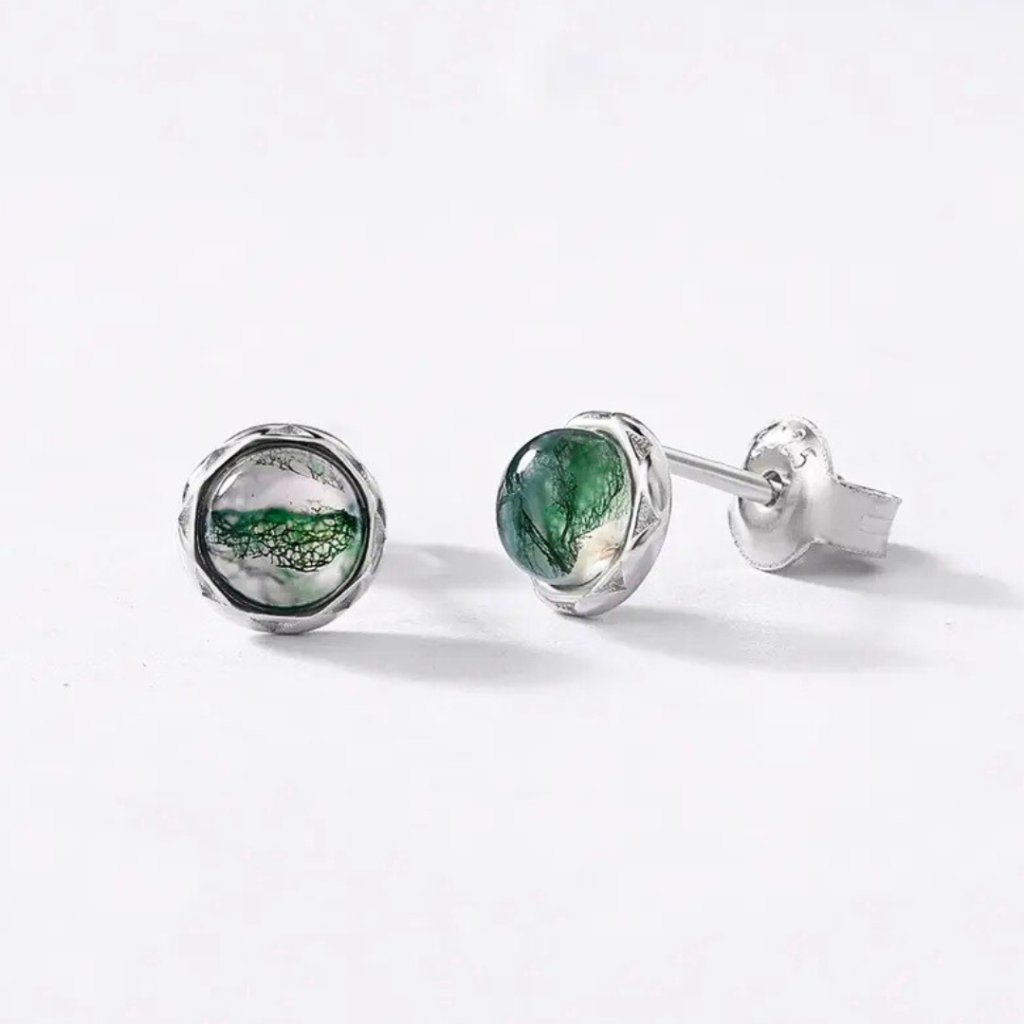 Náušnice FLOW s machovým achátom sú dokonalým stelesnením jednoduchosti a prírodnej krásy. Každý machový achát s priemerom 5 mm je úplne jedinečný, so svojimi zelenými vzormi pripomínajúcimi miniatúrne lesné krajiny, čo z týchto náušníc robí skutočne originálny šperk.