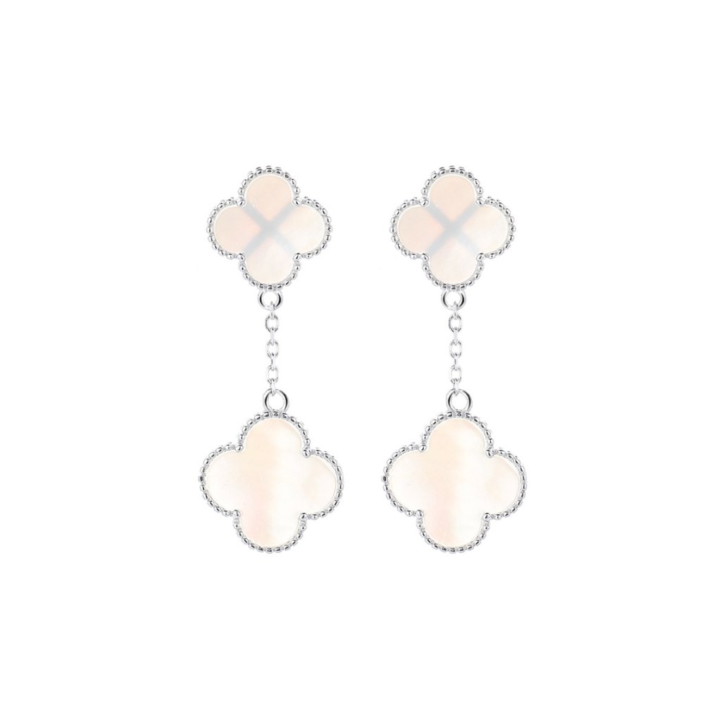 Oba štvorlístky sú zdobené trblietavou bielou perleťou, ktorá dodáva náušniciam jemný, éterický vzhľad. Bezpečné zapínanie na puzetu zaisťuje pohodlné nosenie po celý deň.