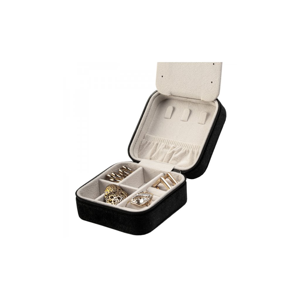 Elegantné puzdro na šperky MILLIE black predstavuje dokonalé spojenie funkčnosti a štýlu. Táto šperkovnica z kvalitného čierneho zamatu je príjemná na dotyk a zároveň dostatočne odolná na každodenné používanie aj cestovanie.