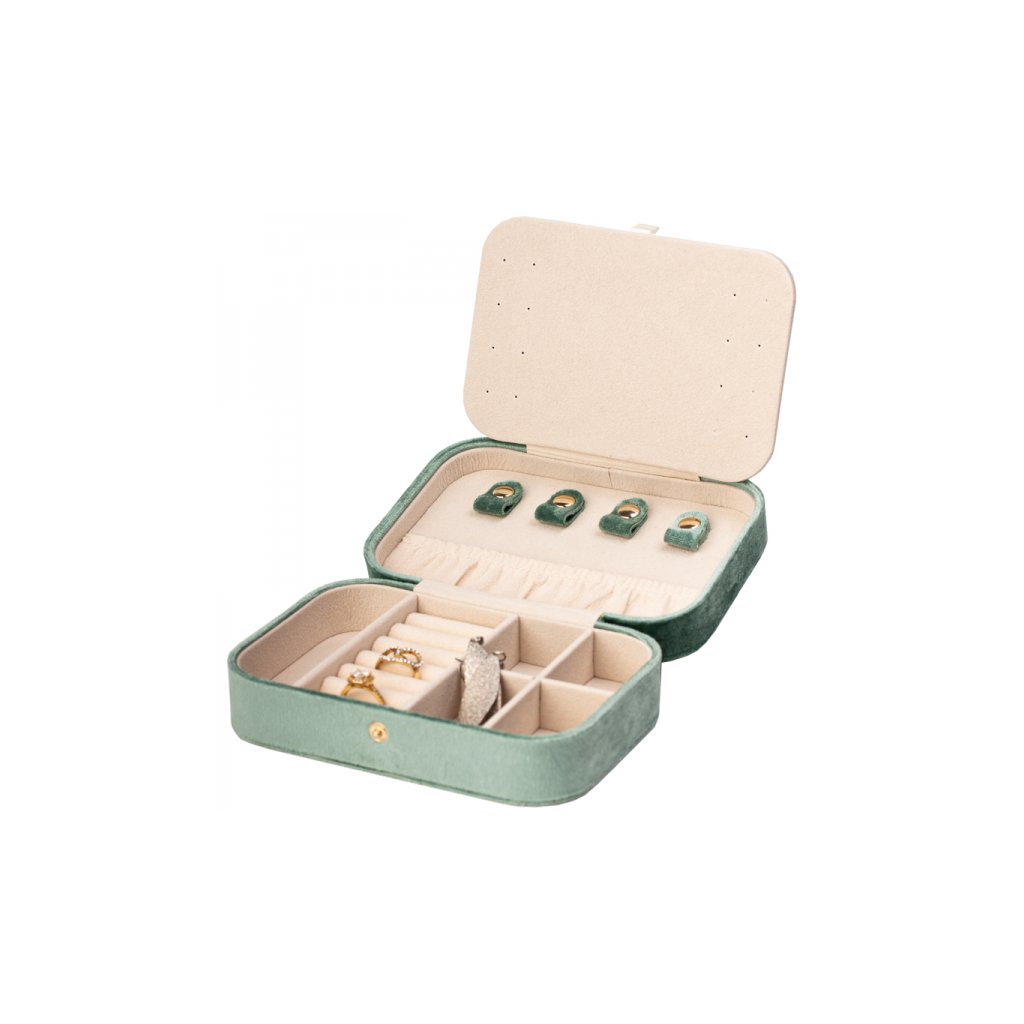 Elegantné puzdro na šperky HAMLET mint predstavuje dokonalé spojenie praktickosti a sviežeho dizajnu. Táto šperkovnica z kvalitného zamatu v mätovej farbe je príjemná na dotyk a stane sa ozdobou každého toaletného stolíka.