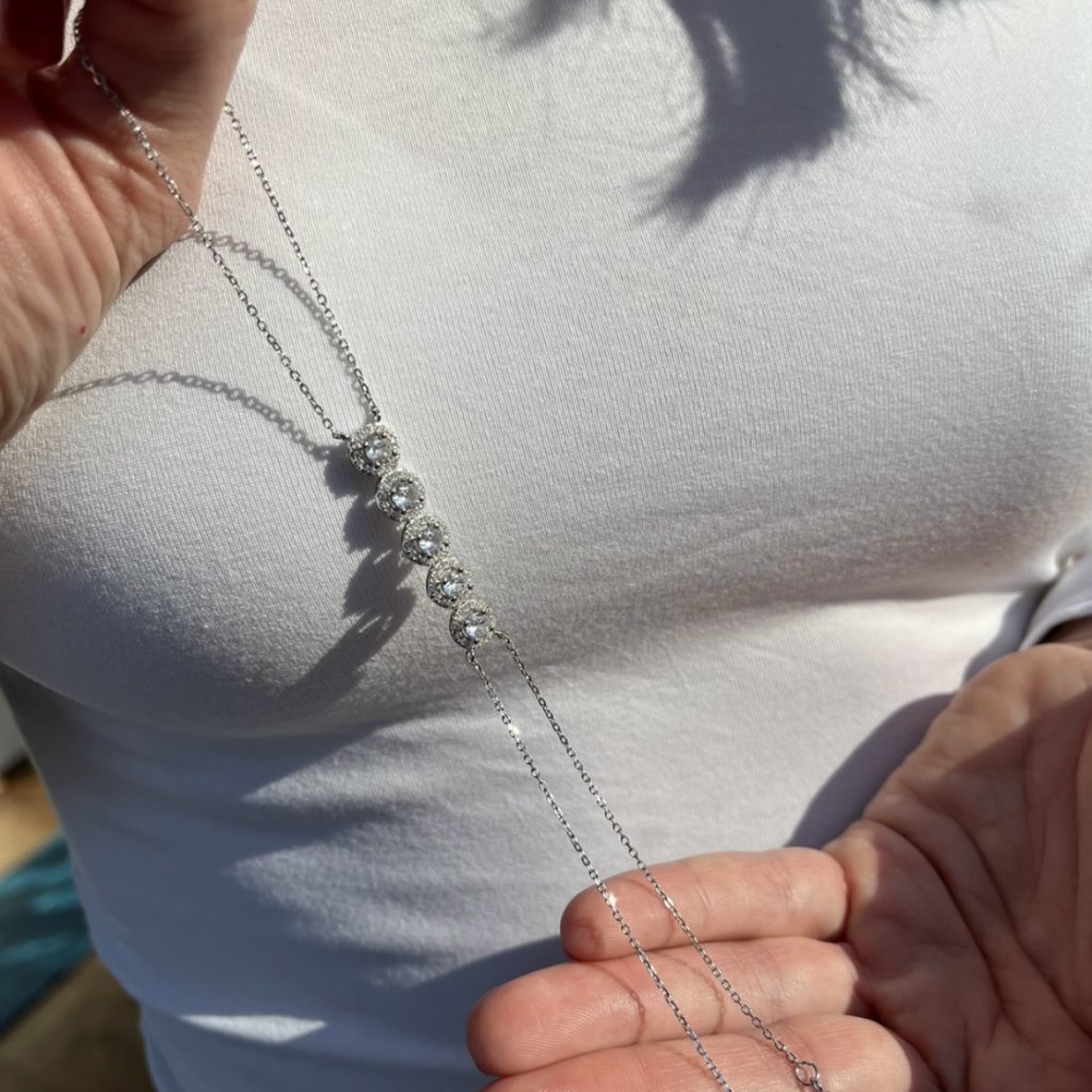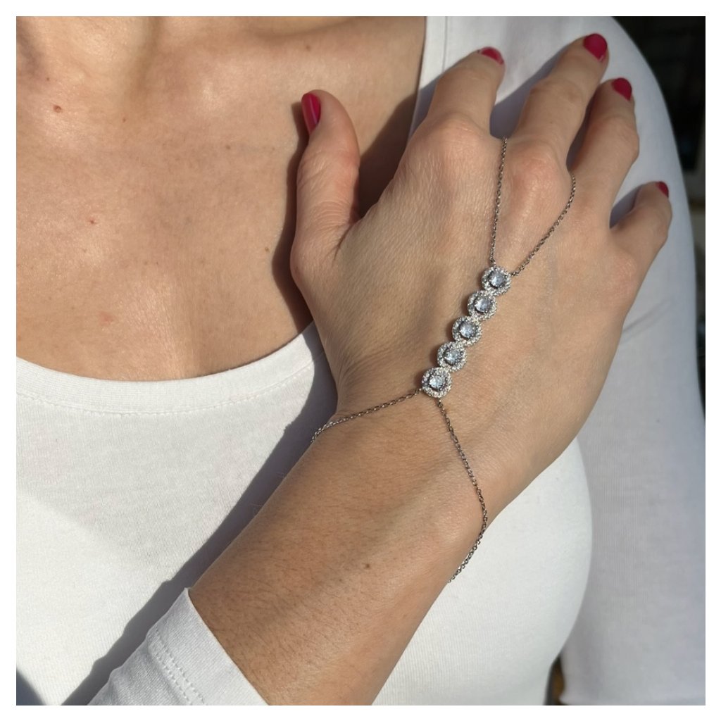 Náramok zdobí podlhovastý prívesok so závesom na prst, ktorý je osadený krásnymi zirkónmi. Tieto drahokamy sa dokonale trblietajú a odrážajú svetlo, čím šperkom dodávajú jedinečný a očarujúci vzhľad.