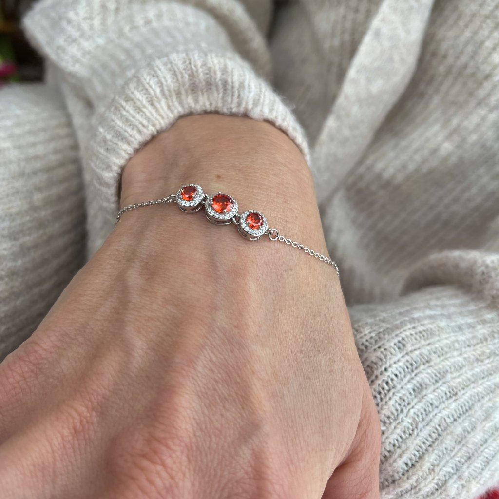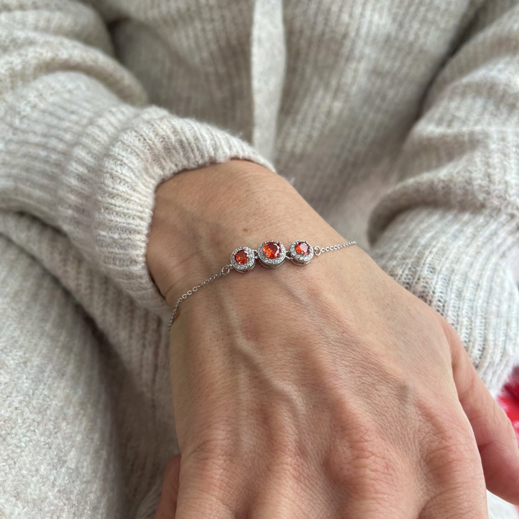 Tenká, ale pevná 18 cm dlhá retiazka s možnosťou predĺženia o 4 cm je vyrobená zo striebra Ag925/1000 a je rhodiovaná pre odolný a lesklý vzhľad. Hlavnou ozdobou tohto náramku sú tri okrúhle červené zirkóny. Jeho červená farba dopĺňa striebornú retiazku a dodáva náramku osobitý a očarujúci vzhľad.