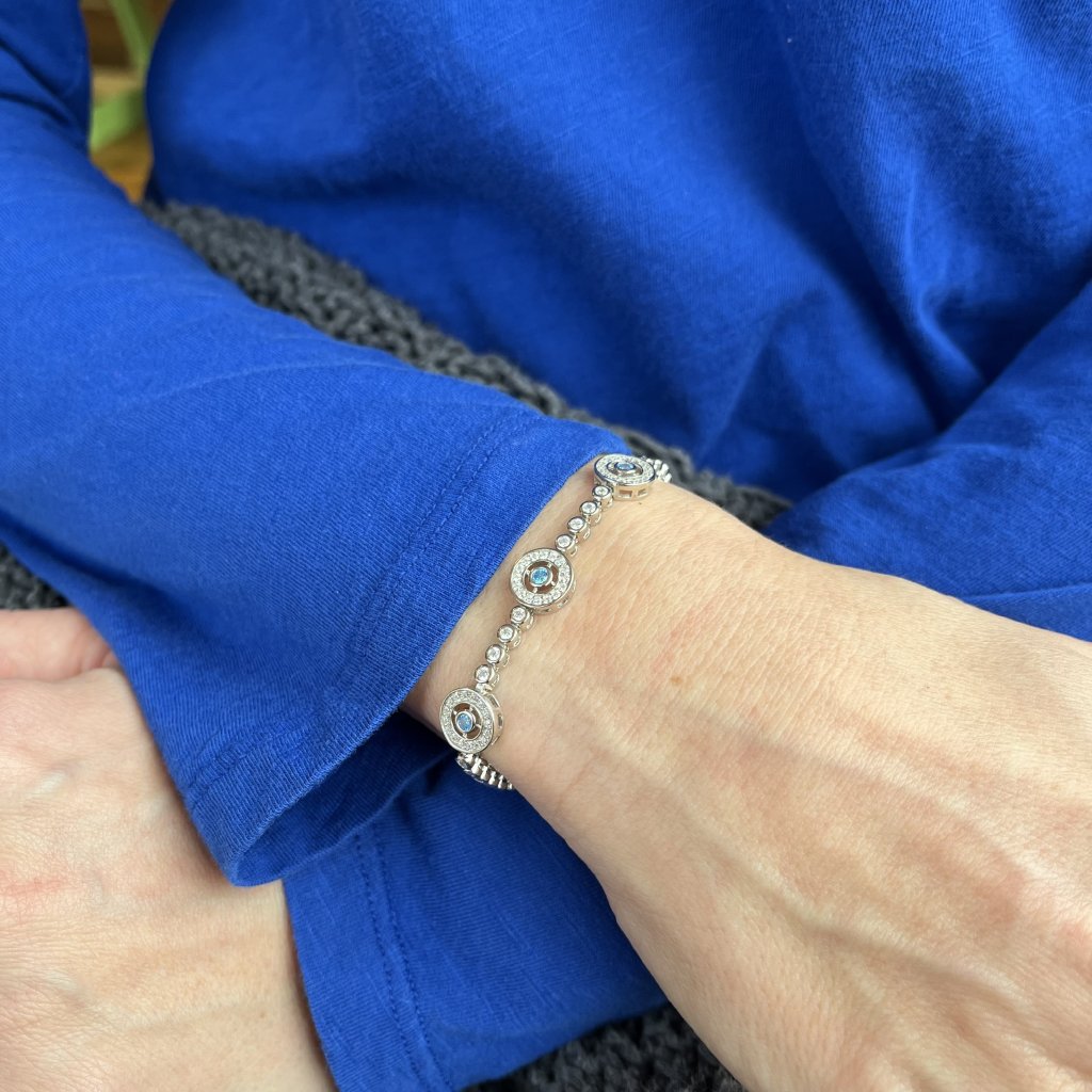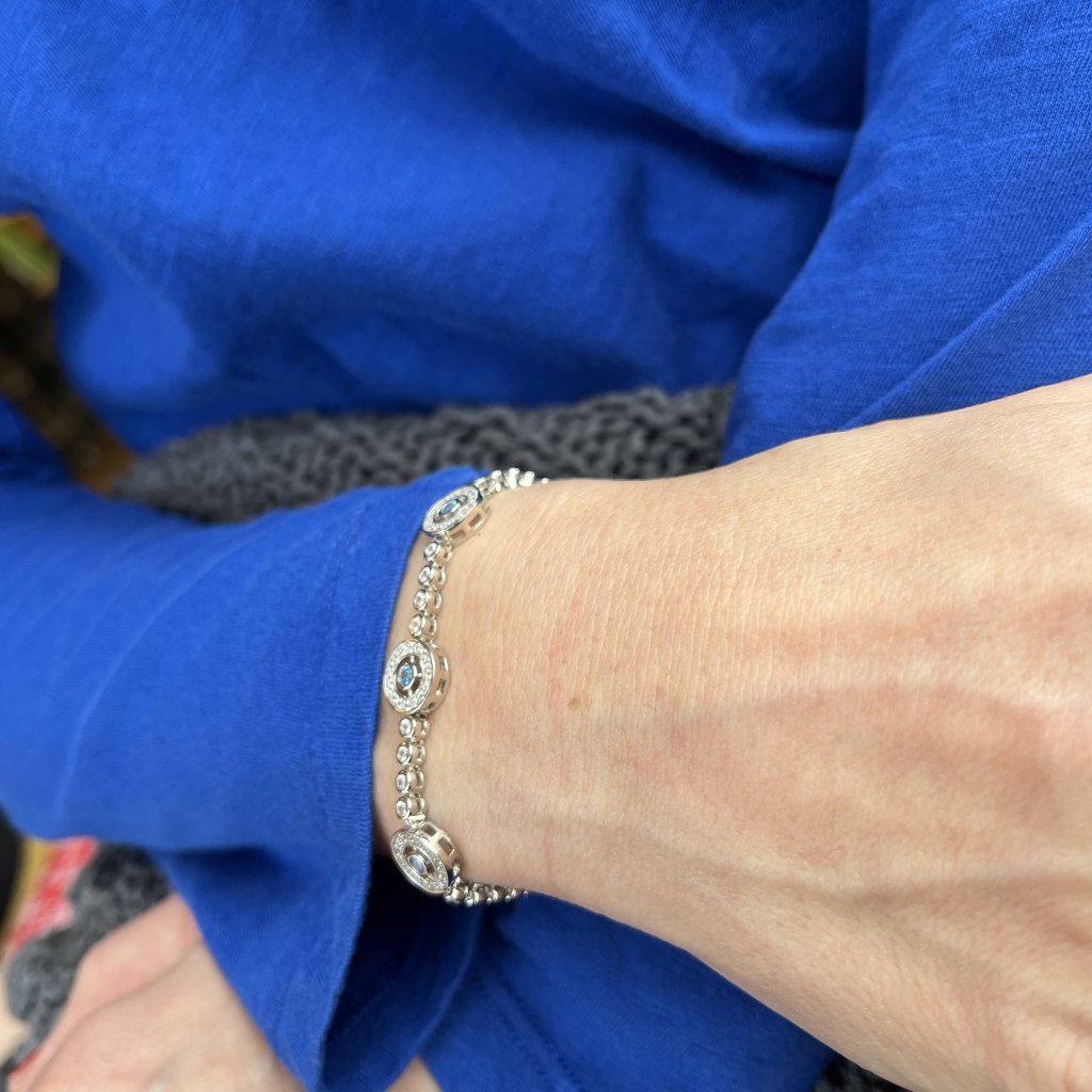 Náramok s dĺžkou 25 cm zdobia číre krúžky osadené jasne modrými kameňmi pripomínajúcimi oko, ktoré je v mnohých kultúrach uznávaným amuletom ochrany a intuície. Každý prsteň s priemerom oka 9 mm je dostatočne výrazný, aby upútal pozornosť bez toho, aby narušil jemnosť celkového dizajnu.