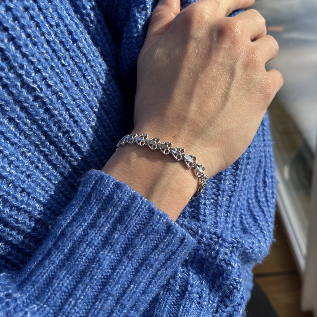 Náramok je vyrobený zo striebra najvyššej rýdzosti Ag925/1000 a jeho povrch je chránený ródiovaním, ktoré zaručuje dlhotrvajúci lesk a odolnosť proti poškriabaniu. Náramok je dlhý 17 + 3 cm a pozostáva zo série jemných srdiečok, ktoré sa pri každom pohybe jemne kolíšu a trblietajú.