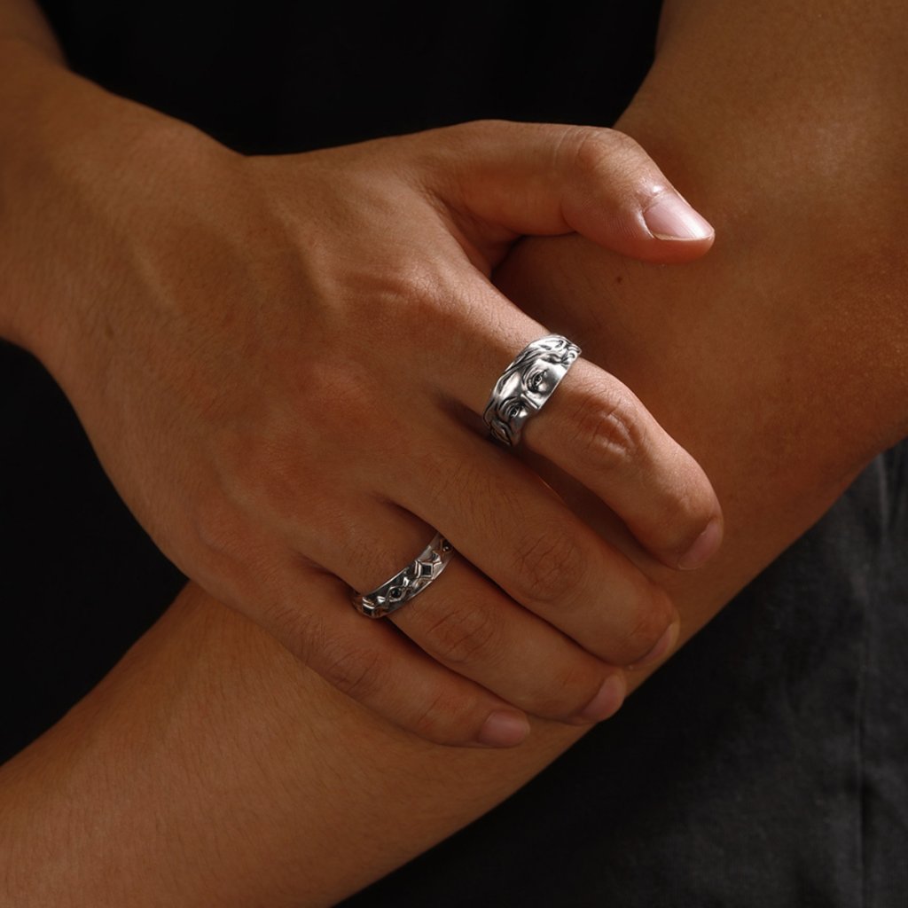 Prsteň je vyrobený z certifikovaného striebra 925 (Ag925/1000), čo garantuje najvyššiu kvalitu a dlhú životnosť šperku. Povrch je ošetrený oxidáciou, ktorá vytvára kontrastný efekt a zvýrazňuje každý detail masky. Táto technika dodáva prsteňu vintage nádych a zároveň podčiarkuje jeho moderný charakter.