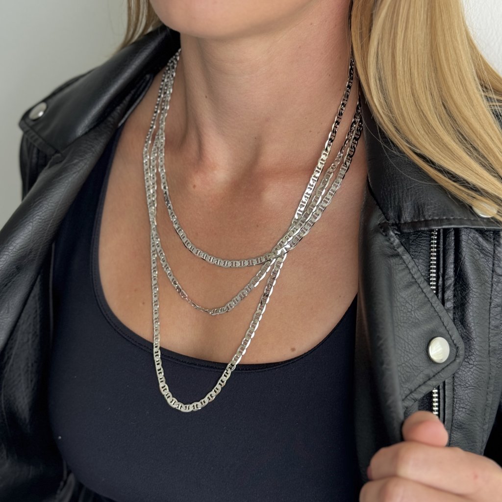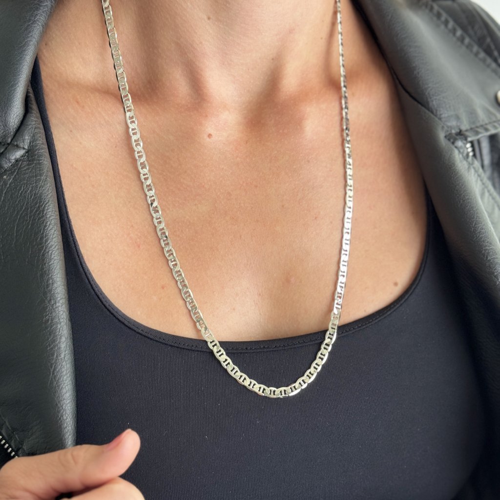 Strieborná retiazka FABIEN v nadštandardnej dĺžke 65 cm predstavuje vrchol luxusu medzi šperkami pre náročných. Štýl Flat Mariner s charakteristickými plochými, vzájomne prepojenými článkami vytvára pôsobivý vzhľad, ktorý z vás urobí stredobod pozornosti.
