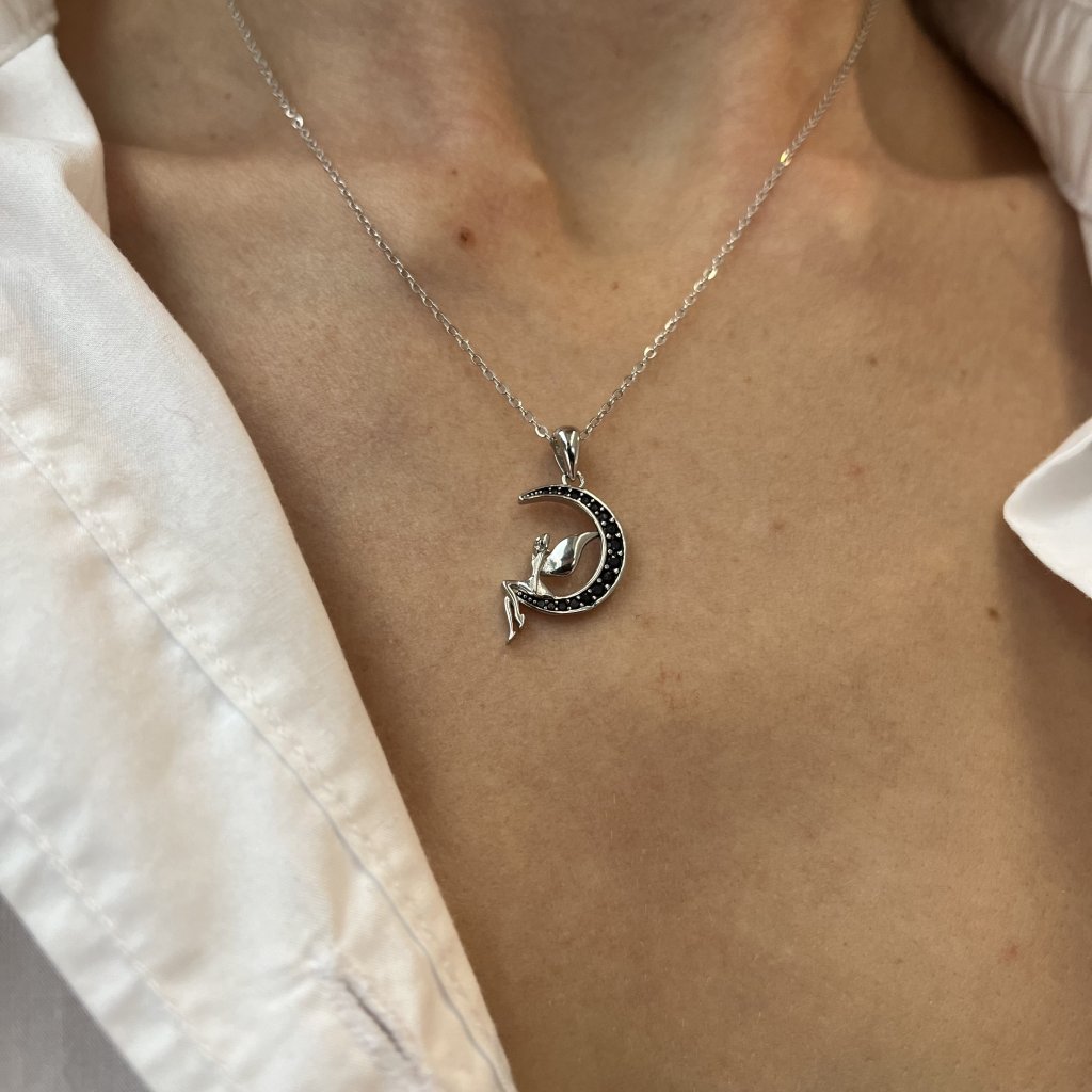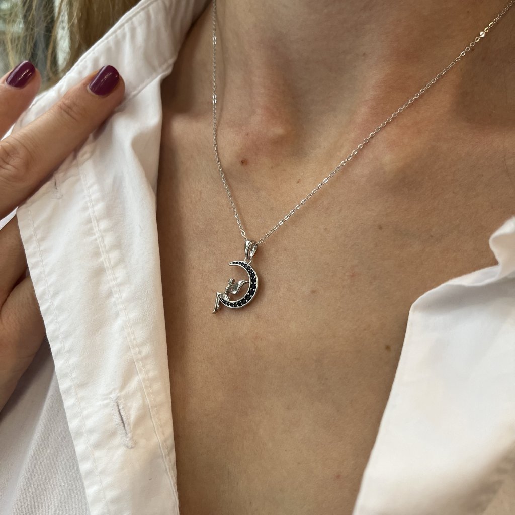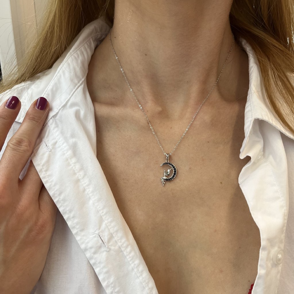 Doprajte si nádych kúzla a premeňte svoj vzhľad s naším jedinečným strieborným náhrdelníkom s motívom mesiaca a víly. Tento náhrdelník je vyrobený z kvalitného striebra 925.