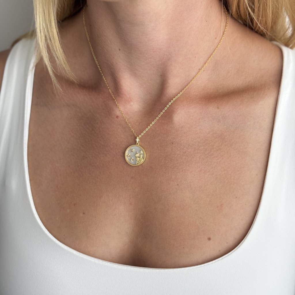 Strieborný prívesok s retiazkou MOONLIGHT VIRGO je ideálnym darčekom pre všetkých narodených v znamení Panny. Tento šperk v sebe spája eleganciu a krásu tohto zemského znamenia. Pozlátený okrúhly prívesok s priemerom 18 mm zdobí vyobrazenie Panny Márie na bielom pozadí, ktoré evokuje žiaru mesačnej oblohy.