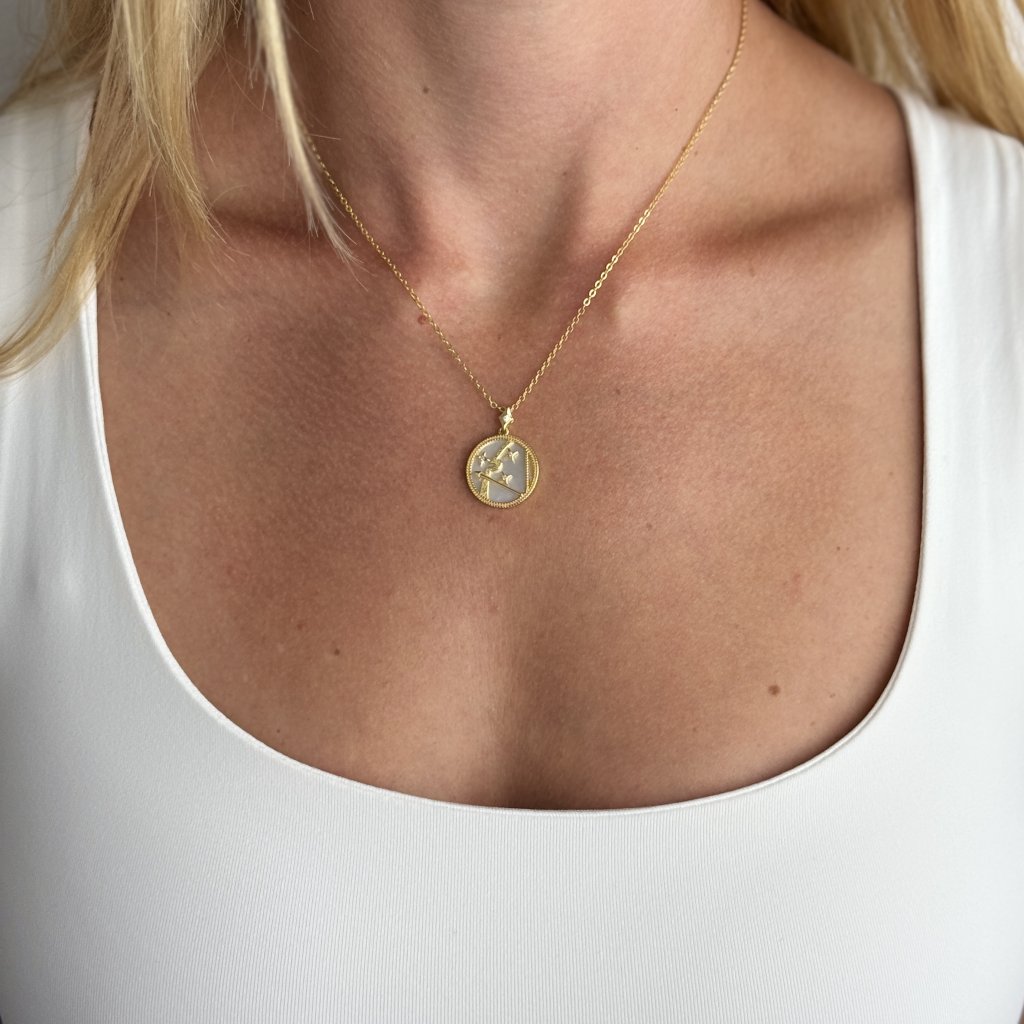 Strieborný prívesok s retiazkou MOONLIGHT SAGITTARIUS je skvelým darčekom pre všetkých narodených v znamení Strelca. Tento šperk v sebe spája slobodomyseľnosť a krásu tohto ohnivého znamenia. Pozlátený okrúhly prívesok s priemerom 18 mm zdobí obrázok Strelca na bielom pozadí, ktorý evokuje žiaru mesačnej oblohy.