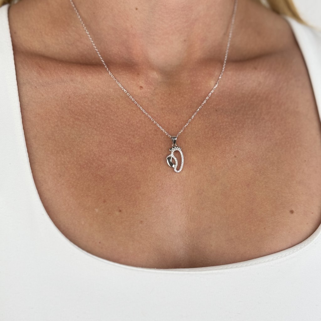 Strieborný prívesok NEWBORN s retiazkou je magický šperk, ktorý oslavuje zázrak nového života. Tento prívesok s rozmermi 11 × 17 mm, vyrobený z kvalitného striebra 925 s ródiovanou povrchovou úpravou, znázorňuje dve nohy - jednu väčšiu a druhú menšiu, ktoré symbolizujú puto medzi matkou a dieťaťom.