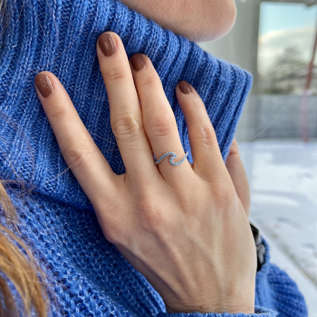 Vznešený smaragdovo modrý zirkón, pripomínajúci hlbiny morského dna, je starostlivo zasadený do striebra 925/1000 a vyvýšený do tvaru vlny.