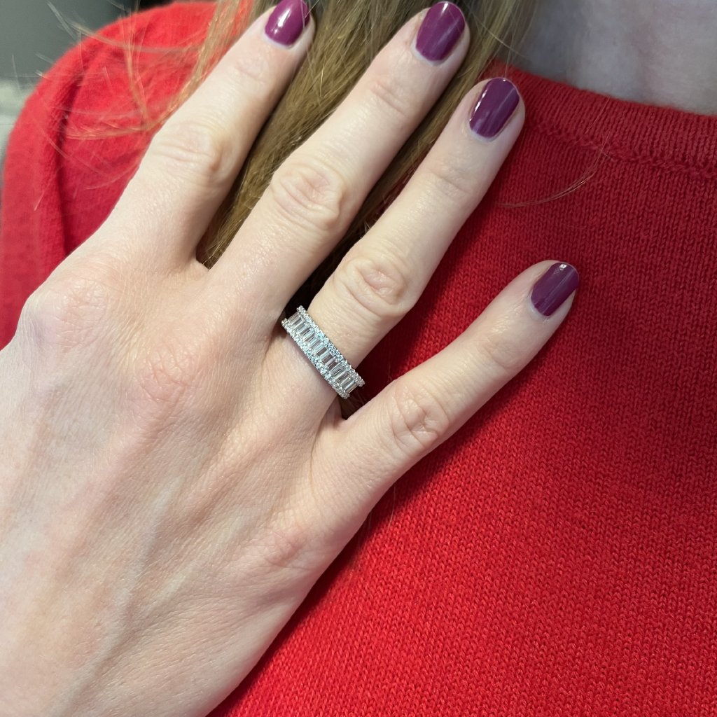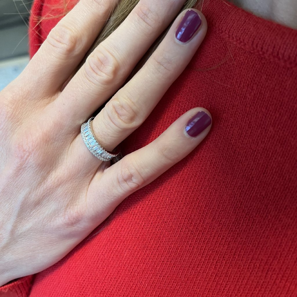 Je vyrobený z čistého striebra 925 a zdobený čírymi zirkónmi, ktoré sa pri každom pohybe ruky tajomne rozžiaria. Povrch prsteňa je dokonale upravený ródiovaním, ktoré mu dodáva výraznejší lesk a vyššiu odolnosť proti poškriabaniu. Šírka prsteňa je presne 5 mm, čo je ideálna veľkosť na zdôraznenie krásy a elegancie ruky, ktorá ho nosí.