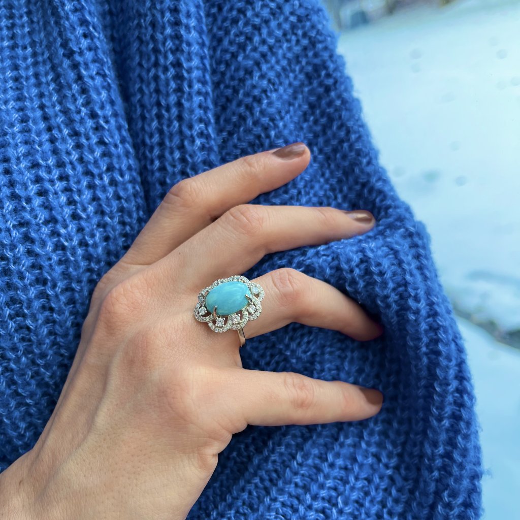Tento úplne jedinečný prsteň vyrobený z čistého striebra 925 vyniká tyrkysovou a čírou farbou, ktoré dokonale dopĺňajú jeho strieborný povrch. Dômyselne vsadený tyrkys je obklopený vlnkami s kubickými zirkónmi, ktoré prsteňu dodávajú neodolateľný lesk a eleganciu.