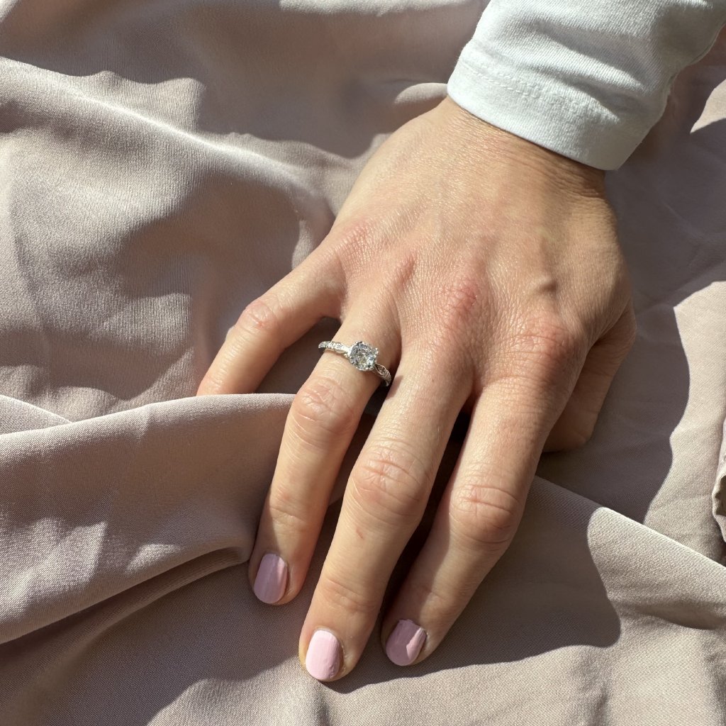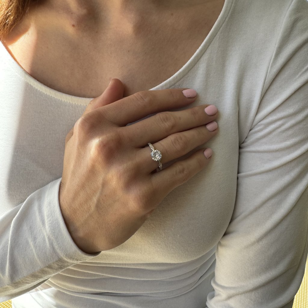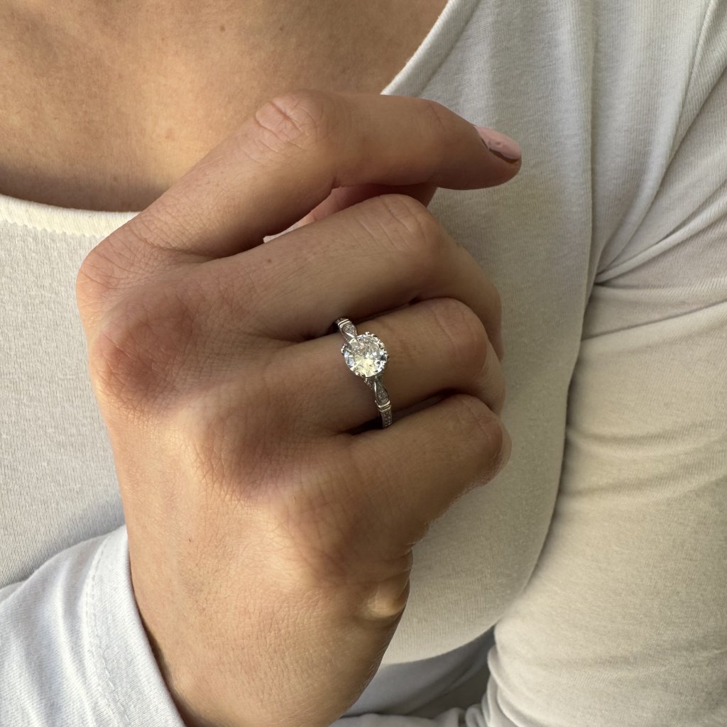Tento prsteň je vyrobený zo striebra Ag925/1000, ktoré bolo rhodiované, aby získalo výnimočný lesk a dlhotrvajúcu odolnosť proti poškriabaniu. Centrálnou ozdobou je veľký číry zirkón s priemerom 6 mm, ktorý je nádherne vsadený do prsteňa a obklopený menšími čírymi zirkónmi pre maximálny lesk.