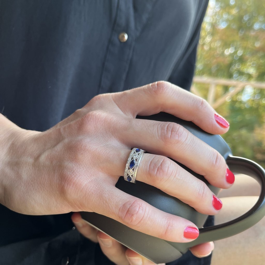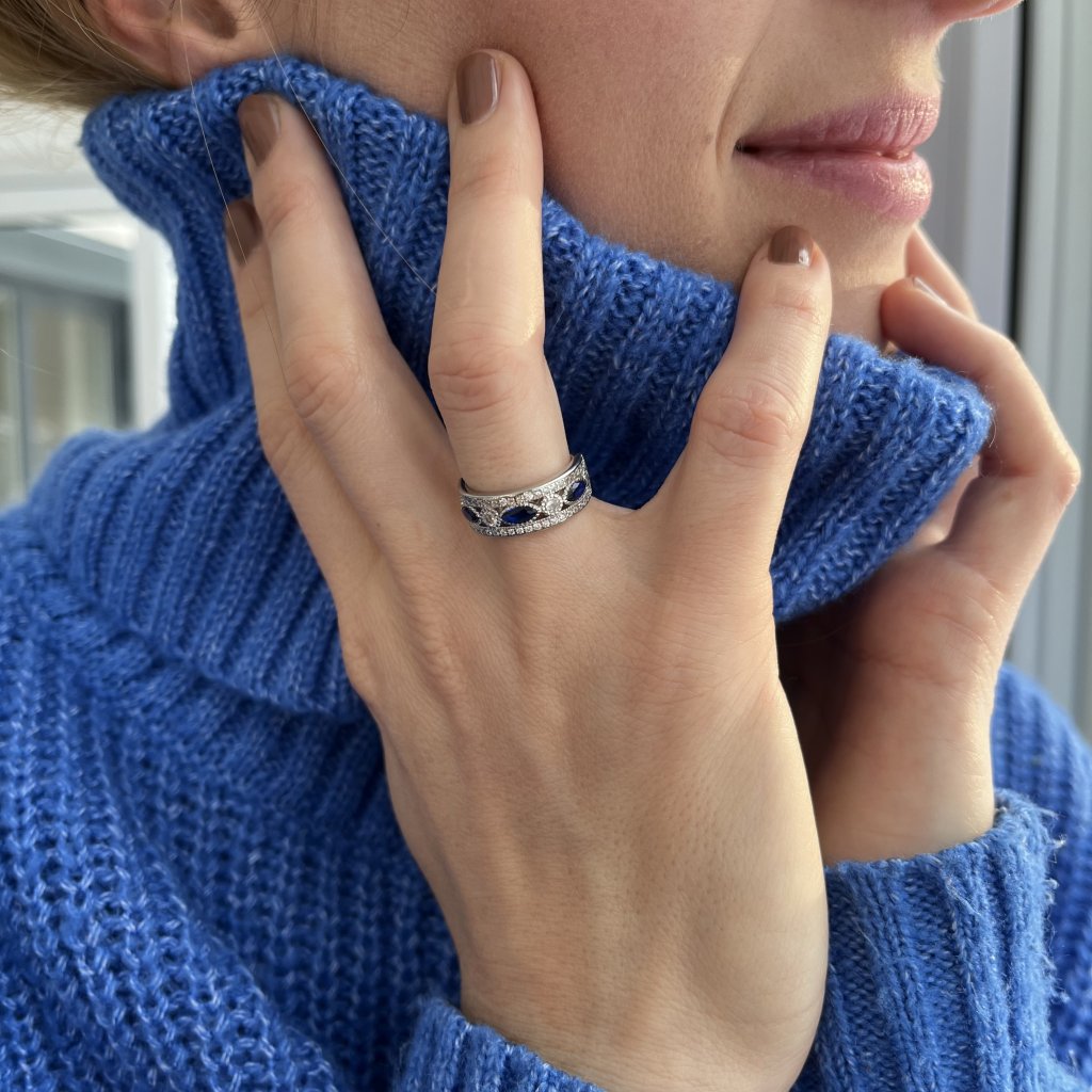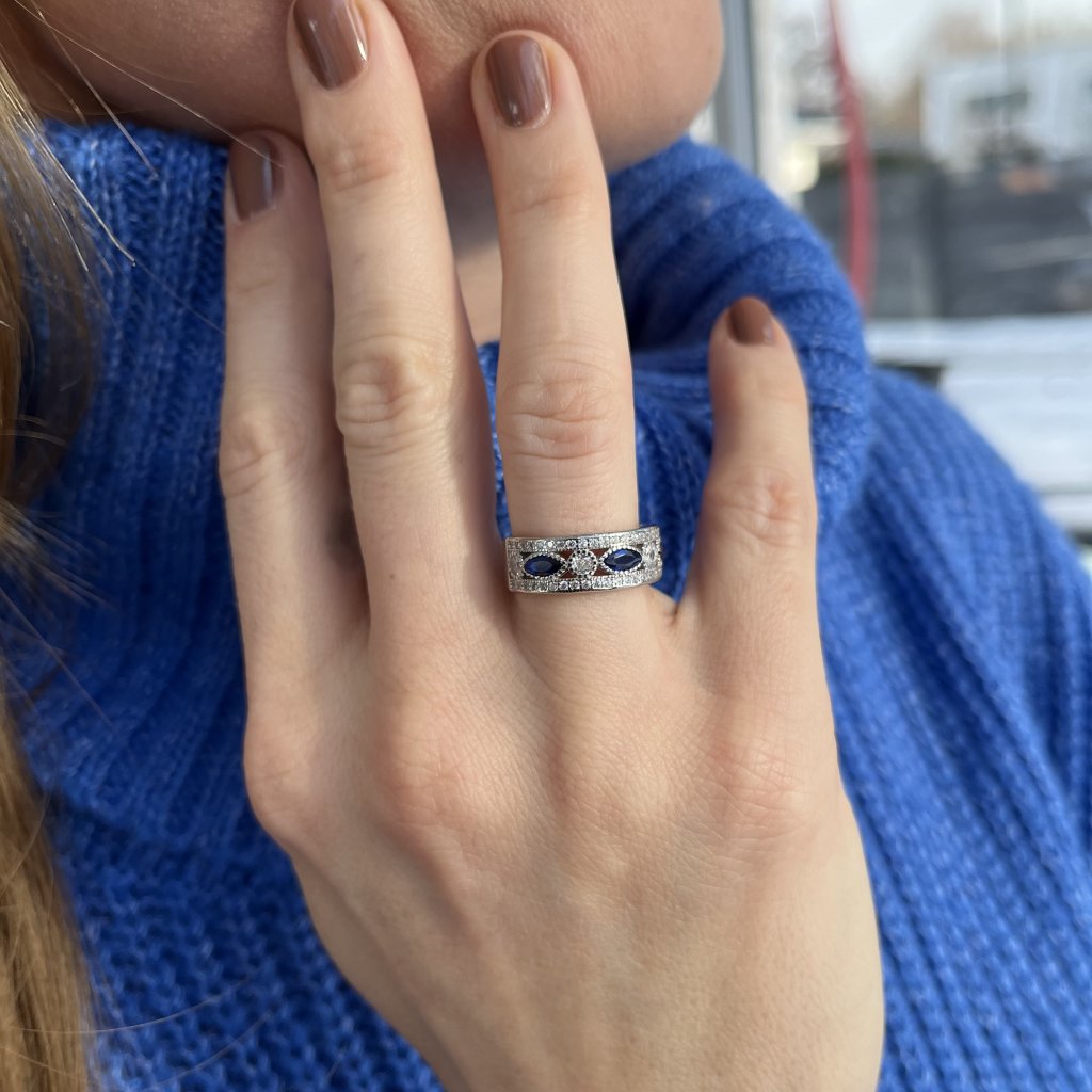 Šperk je vhodný ako perfektný darček pre vašu drahú polovičku alebo ako skvelá príležitosť obdarovať seba. Pôsobivá kombinácia striebra, čírej a modrej farby dodáva prsteňu jedinečnú eleganciu a sofistikovanosť.