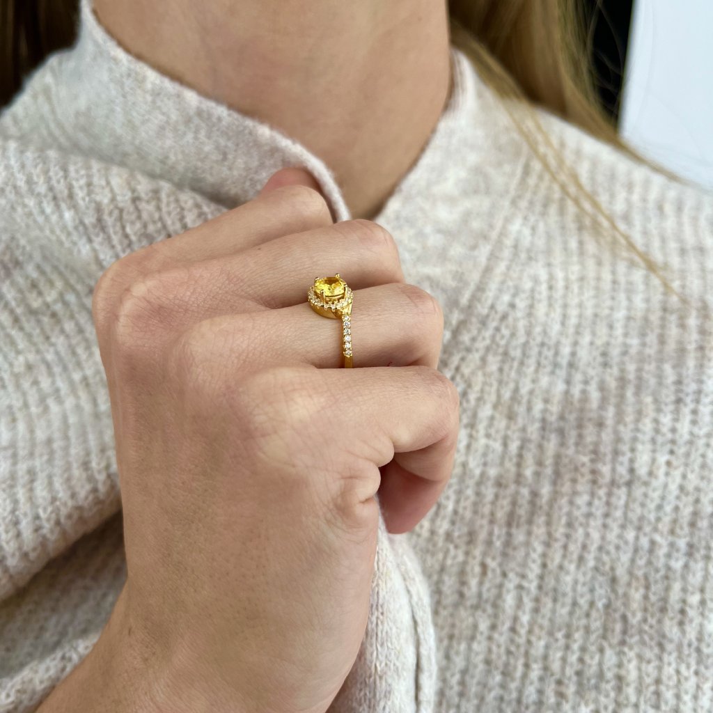 Tento prsteň je vyrobený zo striebra Ag925/1000 a pozlátený, čo mu dodáva jedinečnú žltú farbu a lesklý vzhľad. V strede prsteňa sa nachádza nádherný žltý zirkón s priemerom 6 mm, ktorého jemná farba nádherne kontrastuje s pozláteným striebrom.