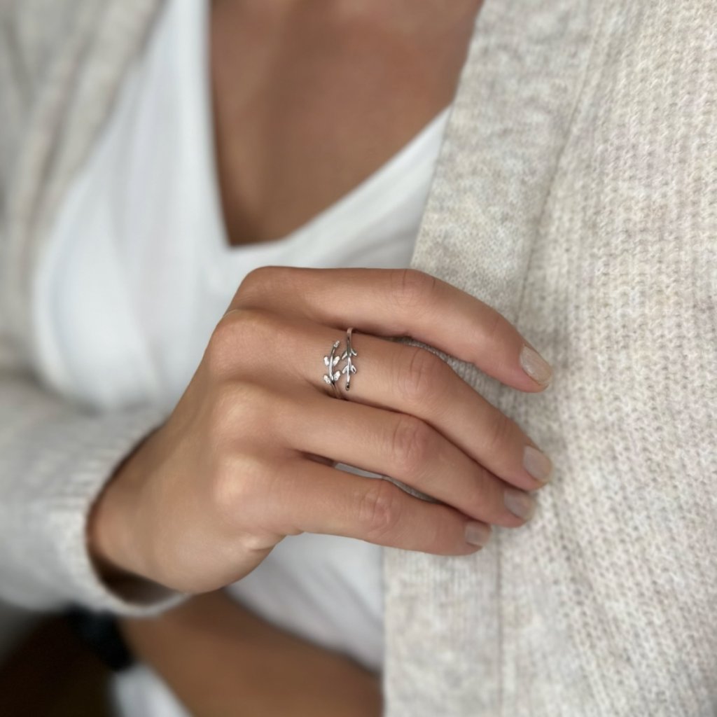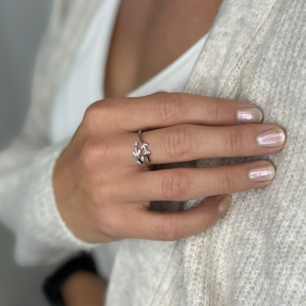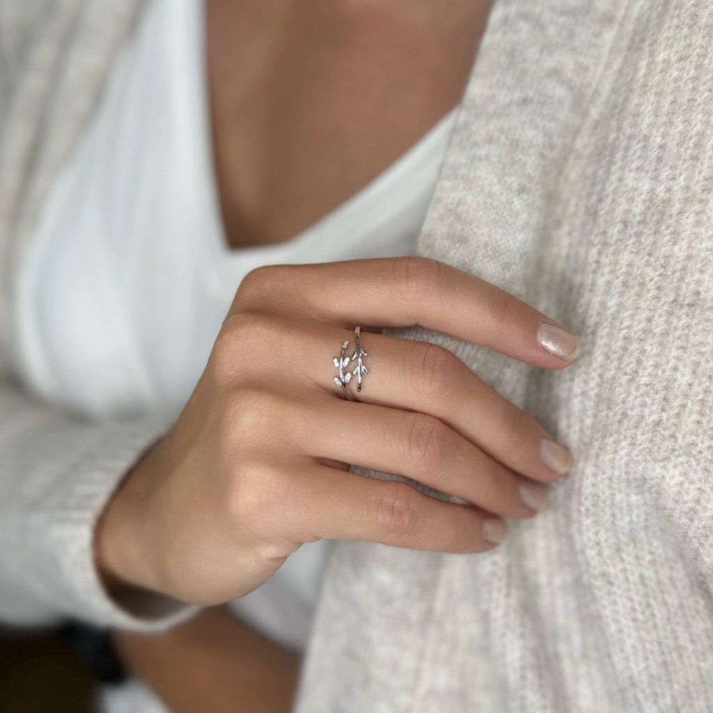 Tento nastaviteľný prsteň je vyrobený z kvalitného rhodiovaného striebra Ag925/1000 a zdobia ho jemné vetvičky čírych zirkónov, ktoré mu dodávajú eleganciu a iskru.