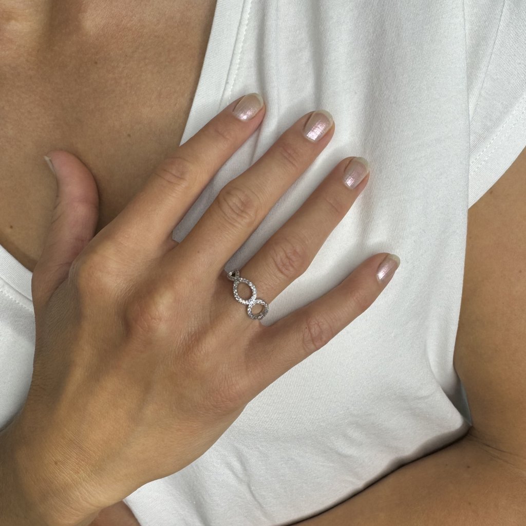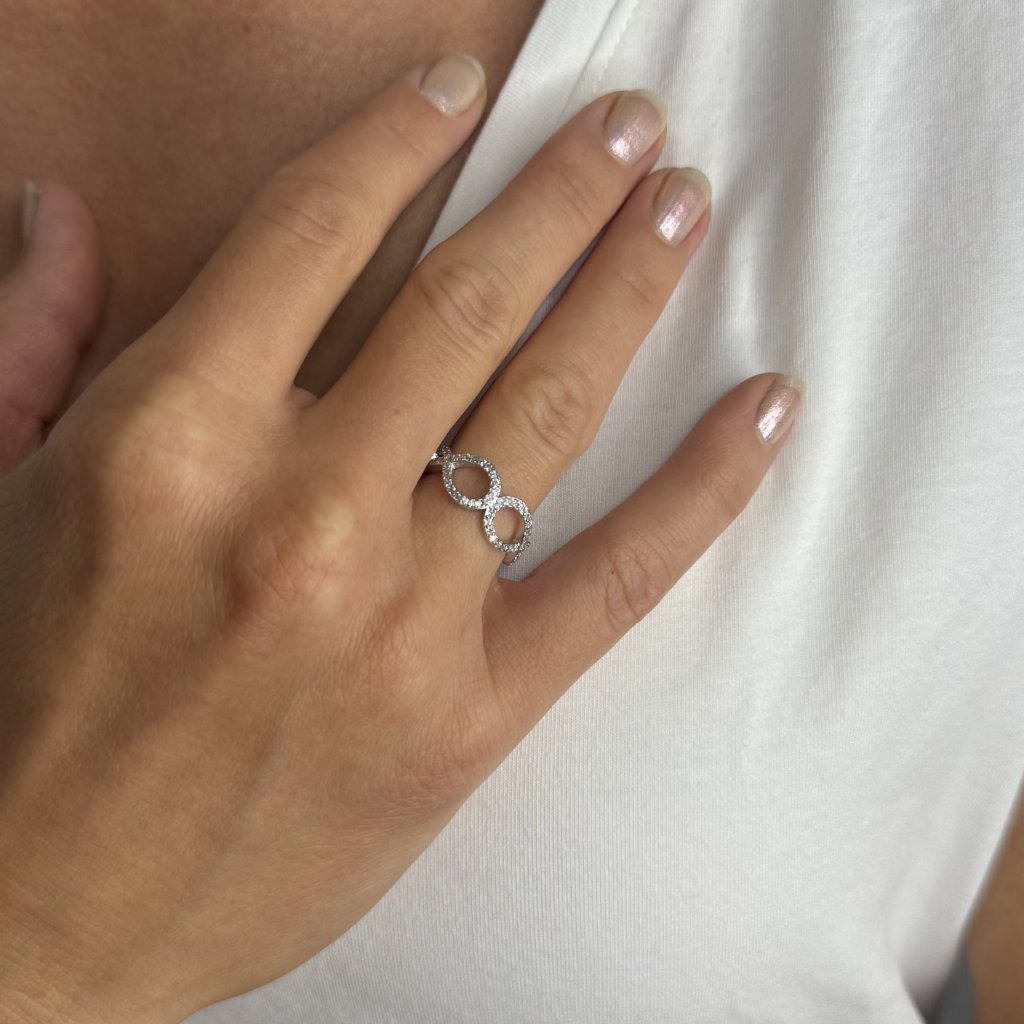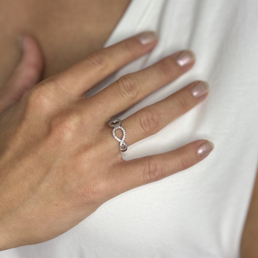 Tento prsteň vyrobený z kvalitného ródiovaného striebra Ag925 a osadený trblietavými zirkónmi zaujme nadčasovým dizajnom s motívom nekonečna.Vďaka ródiovej povrchovej úprave je prsteň chránený pred opotrebovaním a zmenou farby, takže si dlho zachová svoj lesk a krásu. So šírkou 7 mm je vhodný na každodenné nosenie aj na špeciálne príležitosti.