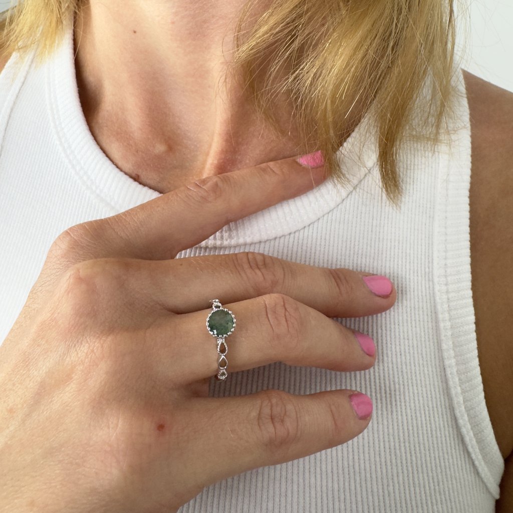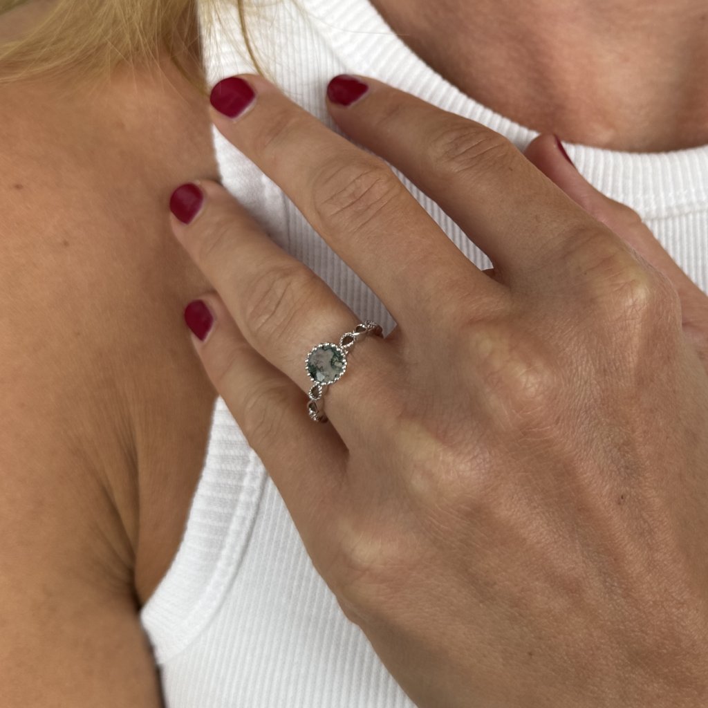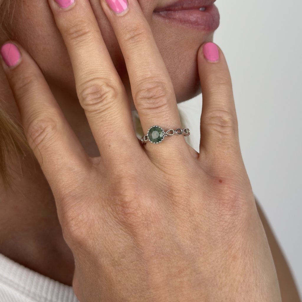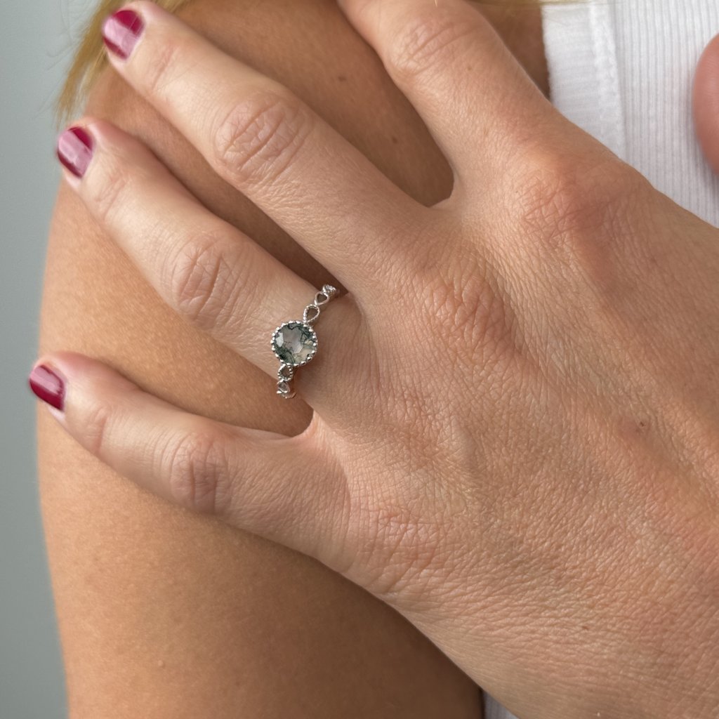 Strieborný prsteň ELODIE je stelesnením prirodzenej krásy a remeselného spracovania. Vyrobené z vysokokvalitného striebra 925 s ródiovanou povrchovou úpravou, ktorá zaručuje dlhotrvajúci lesk a ochranu pred stratou farby. Srdcom prsteňa je fascinujúci machový achát s priemerom 6 mm, ktorý upúta pozornosť svojou jedinečnou štruktúrou pripomínajúcou miniatúrnu krajinu.