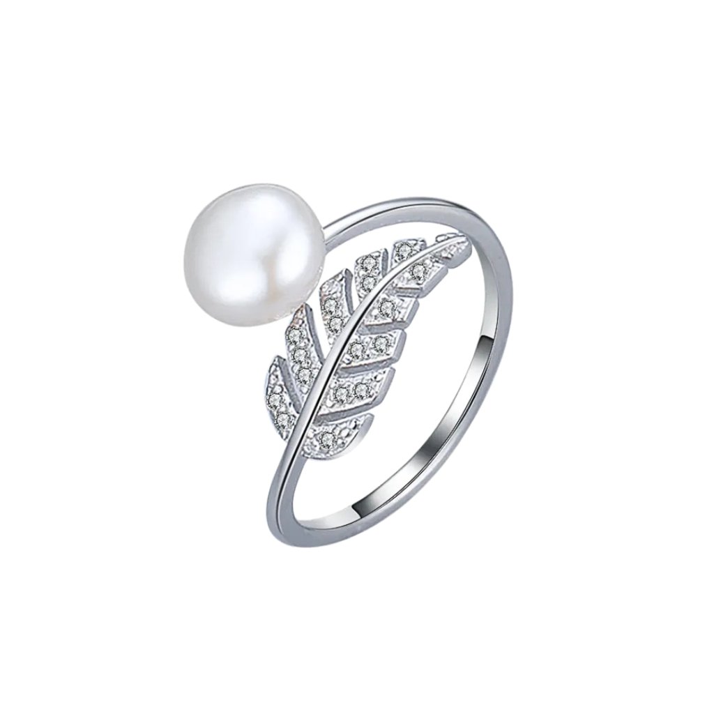 Prstenu dominuje krásna perla s priemerom 8 mm na jednej strane a elegantný list posiaty trblietavými zirkónmi na druhej strane. Tento šperk vyrobený z kvalitného striebra 925/1000 je dokonalou kombináciou tradičného remeselného spracovania a moderného dizajnu.