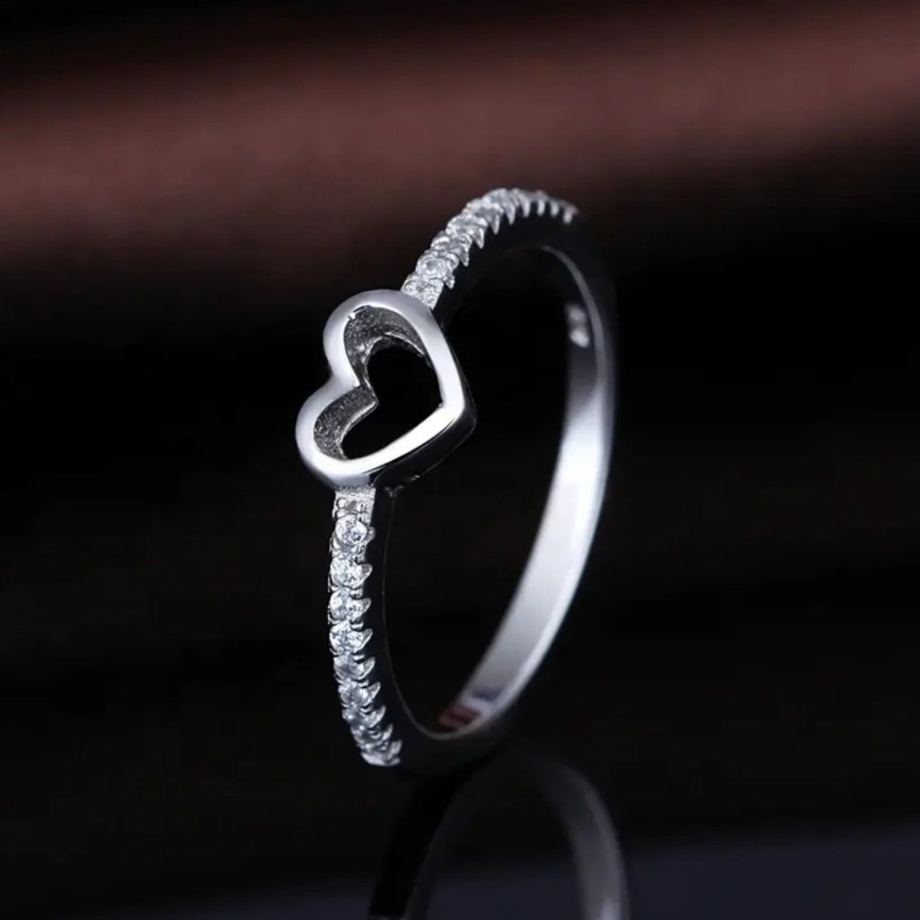 Strieborný prsteň MARIKA je šperkom, ktorý očarí každú romantickú dušu. Elegantný dizajn tohto prsteňa kombinuje symbol lásky v podobe precízne spracovaného srdiečka s rozmermi 6 × 6 mm s radom trblietavých zirkónov, ktoré zdobia obe strany obrúčky. Tieto drobné kamienky dodávajú prsteňu iskru a podčiarkujú jeho romantický charakter.