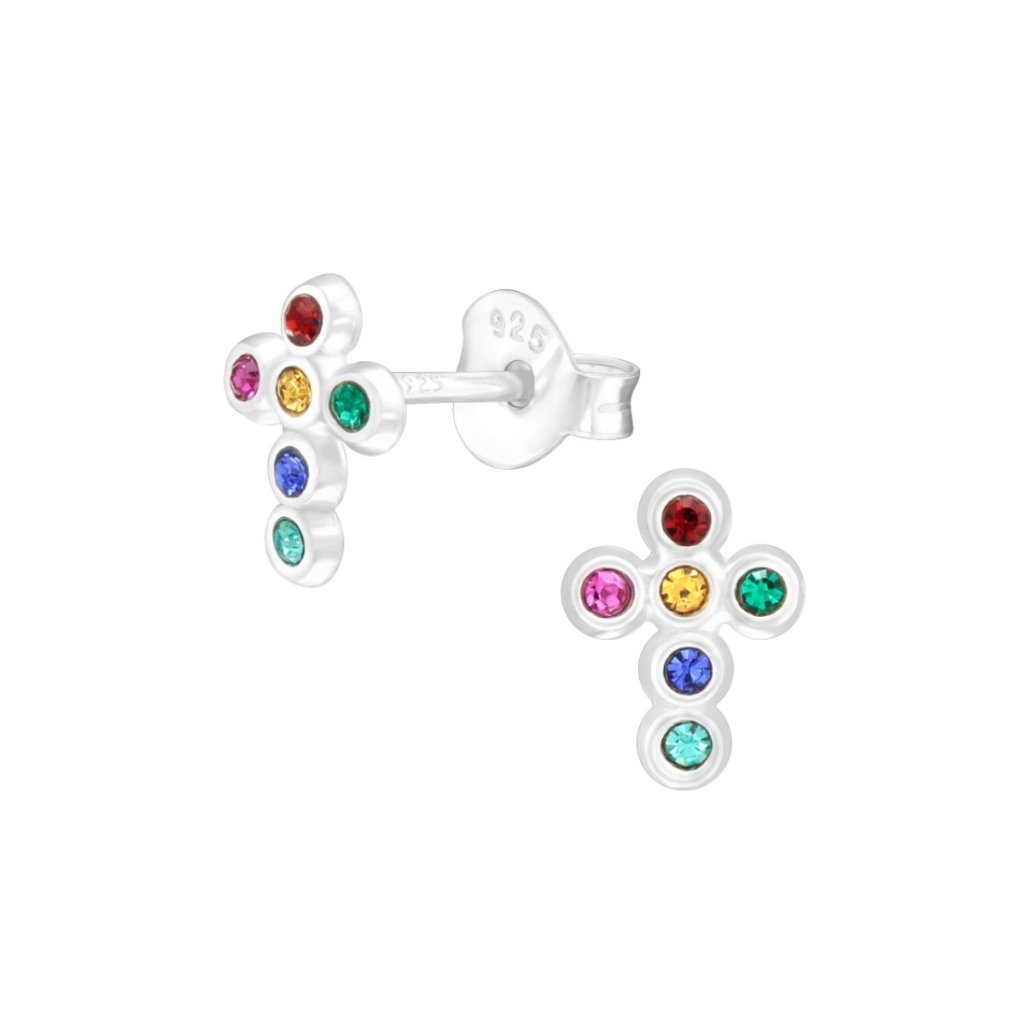 Strieborné náušnice FAREBNÝ KRÍŽIK sú jemným a elegantným šperkom z rýdzeho striebra 925/1000 s motívom krížika osadeného farebnými zirkónmi. Tieto drobné napichovačky sú zdobené trblietavými kamienkami v ružovej, červenej, modrej, zelenej a žltej farbe, ktoré vytvárajú veselý viacfarebný vzhľad plný jasu a radosti.