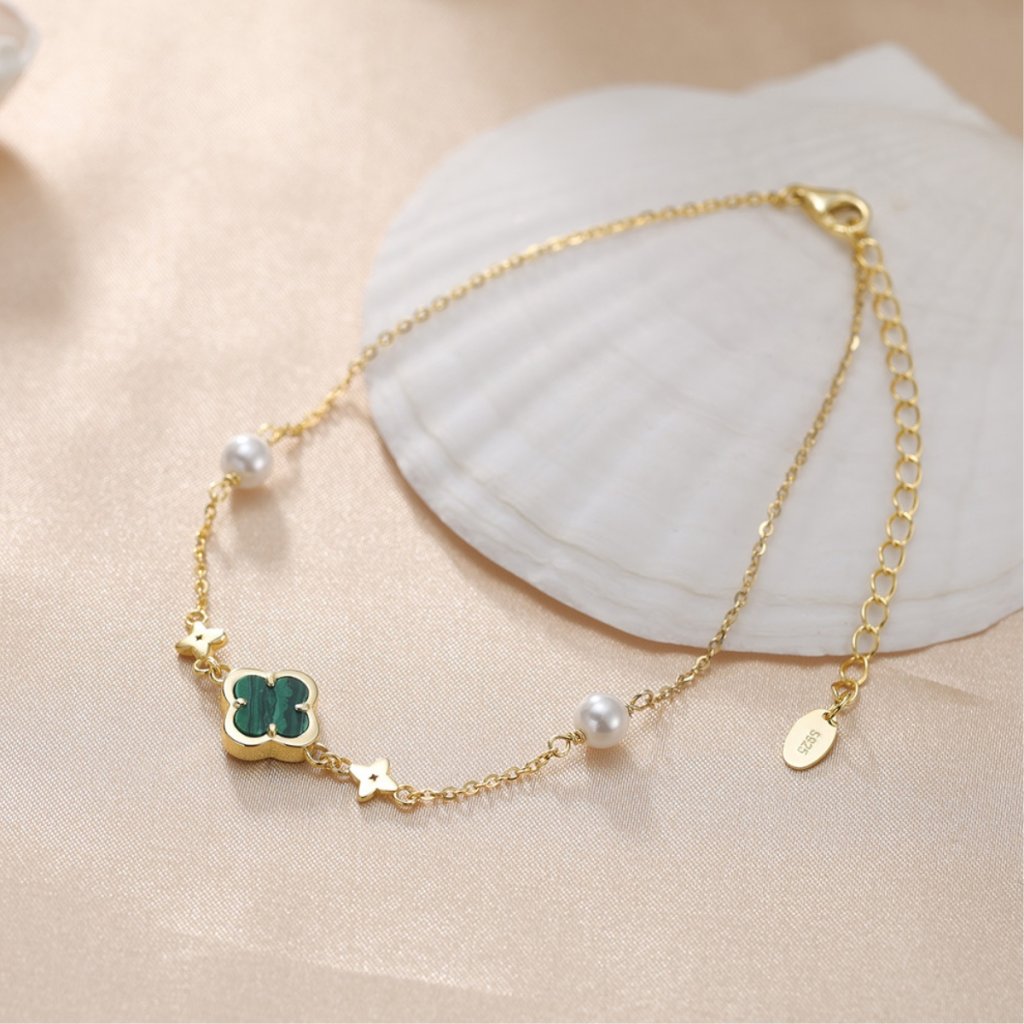 Dominantou šperku je prívesok štvorlístka, symbol šťastia, doplnený o jemné perličky, malachit a sladkovodnú perlu, ktoré šperku dodávajú elegantný a nežný vzhľad. Vďaka predlžovaciemu retiazku 21 + 5 cm krásne sedí aj na silnejšom zápästí alebo na členku.