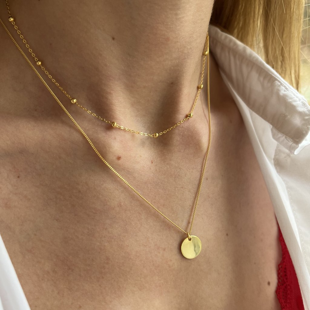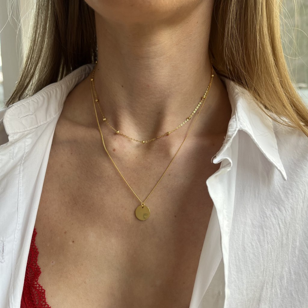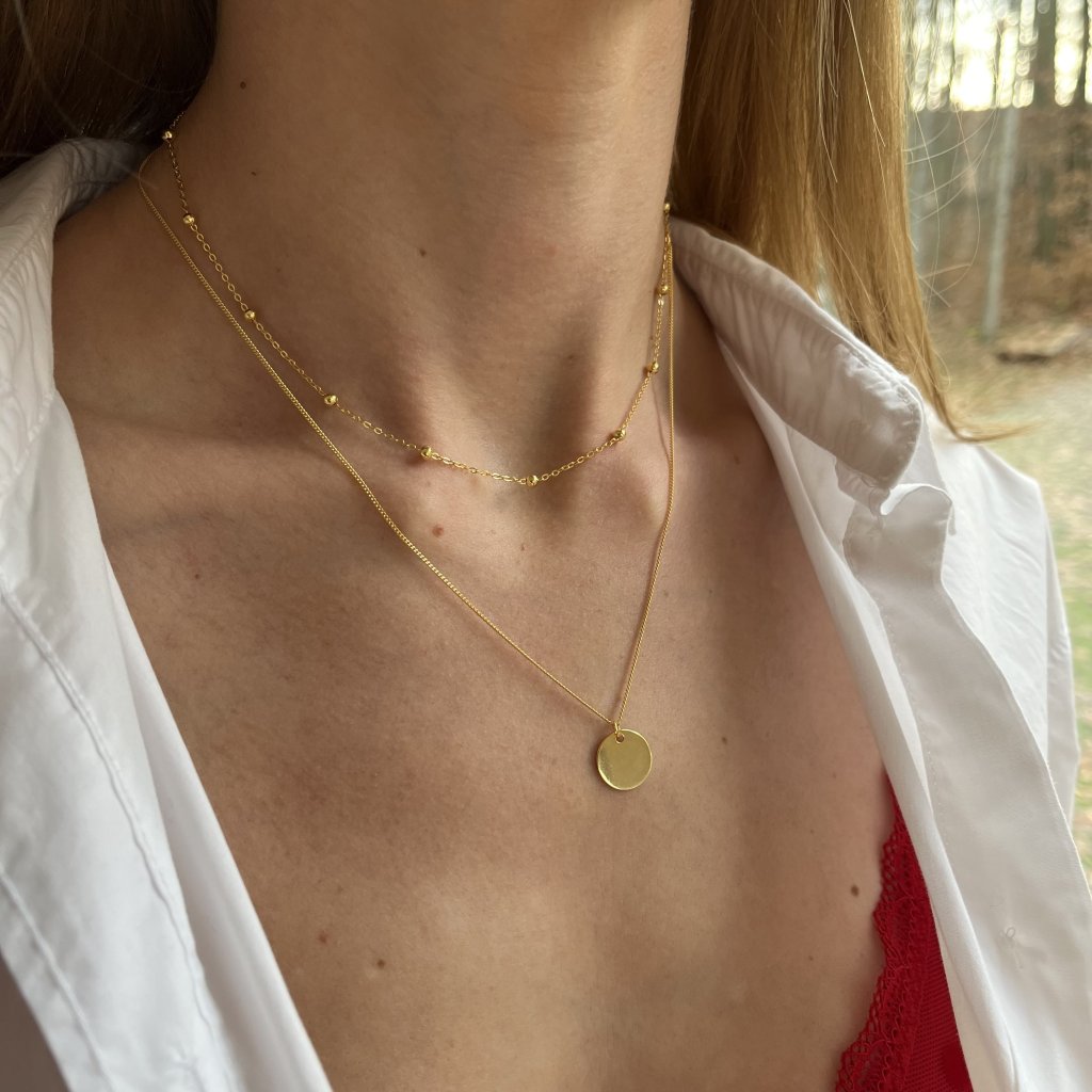 Prvá retiazka s dĺžkou 35 + 4 cm sa prispôsobí vášmu krku ako škrtidlo a dodá mu sofistikovaný prvok, zatiaľ čo druhá retiazka s dĺžkou 41 cm je elegantne nižšia a zakončená malým, ale výrazným 12 mm príveskom. Obe vrstvy sú vyrobené z kvalitného striebra s rýdzosťou Ag925/1000 a pozlátené pre väčší lesk a ochranu pred opotrebovaním.