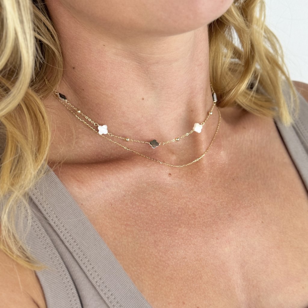 Retiazka LUCKY CARRIE z kvalitného striebra 925/1000 s luxusným 14-karátovým zlatým povrchom prináša do vašej šperkovnice kúsok šťastia a elegancie. Jemná retiazka zdobí tematické prívesky - štvorlístok ako symbol šťastia, doplnený nádhernými sladkovodnými perlami tvarovanými do štvorlístkov.