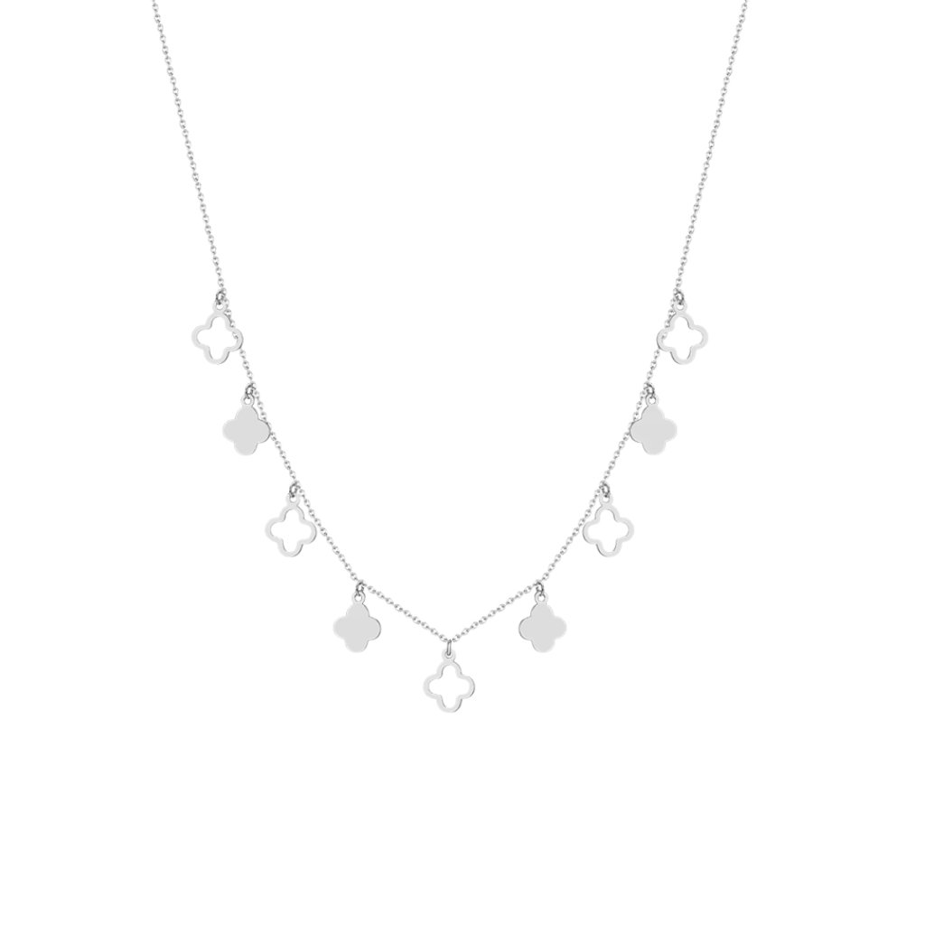 Náhrdelník je vyroben z rýdzeho striebra 925/1000 s rhodiovou povrchovou úpravou, ktorá zaisťuje dlhotrvajúci lesk a ochranu pred zmatnením. Jemné prívesky štvorlístkov o rozmeroch 8 × 8 mm sú precízne spracované s dôrazom na každý detail, čo vytvára nežný a elegantný vzhľad.