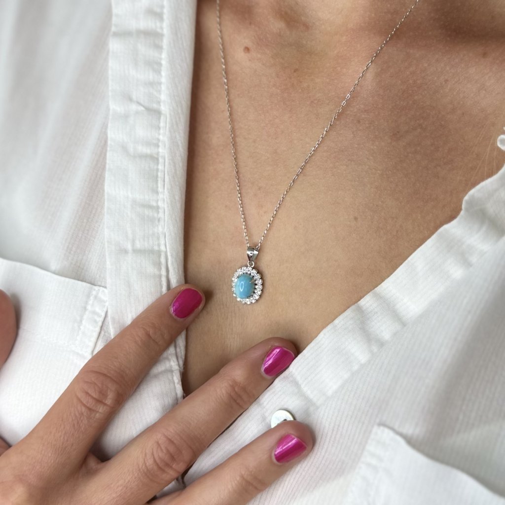 Tento náhrdelník je vyrobený zo striebra s rýdzosťou Ag925/1000 a povrchovo upravený technológiou ródiovania, ktorá mu dodáva ten správny lesk a eleganciu. Jeho dĺžka 51 cm je ideálna pre všetky dámy, ktoré chcú v spoločnosti vyniknúť. Jeho tyrkysová farba je taká intenzívna a svieža, že okamžite upúta pozornosť.