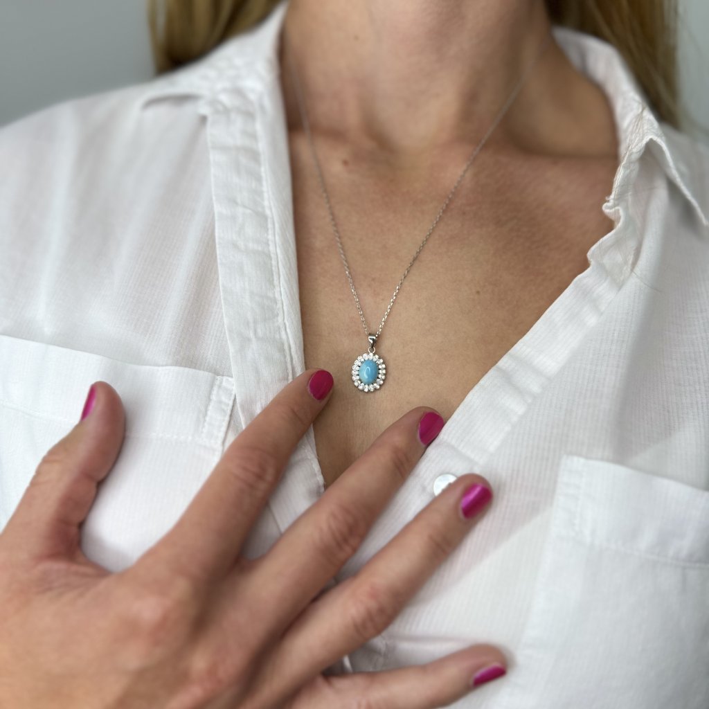 Tento náhrdelník je vyrobený zo striebra s rýdzosťou Ag925/1000 a povrchovo upravený technológiou ródiovania, ktorá mu dodáva ten správny lesk a eleganciu. Jeho dĺžka 45,5 cm je ideálna pre všetky dámy, ktoré chcú v spoločnosti vyniknúť. Jeho tyrkysová farba je taká intenzívna a svieža, že okamžite upúta pozornosť.