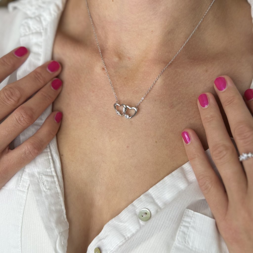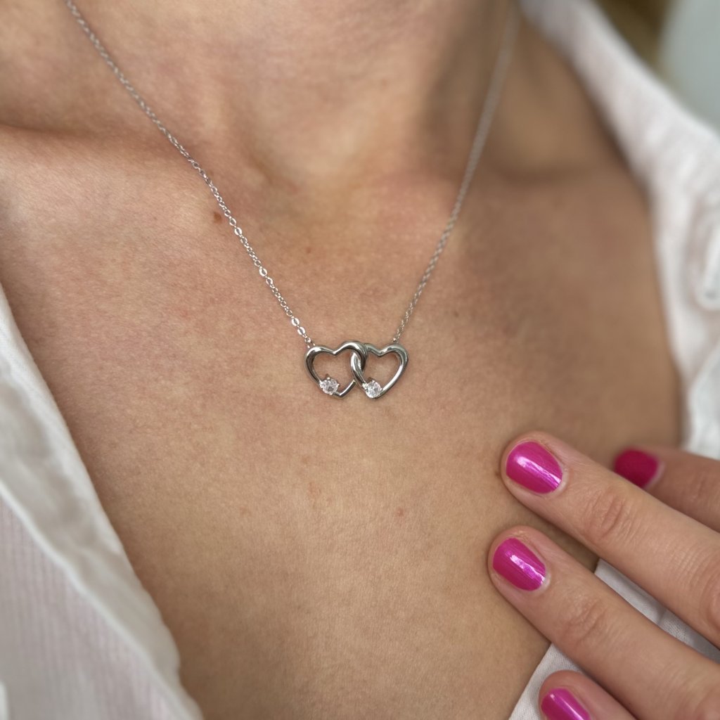 Tento jedinečný šperk je vyrobený z kvalitného striebra 925/1000 a je zdobený drobnými zirkónmi, ktoré sú umiestnené na spodnej časti oboch sŕdc. Každý zirkón má priemer 3 mm a dodáva tomuto jemnému šperku nádych rafinovanosti a lesku.