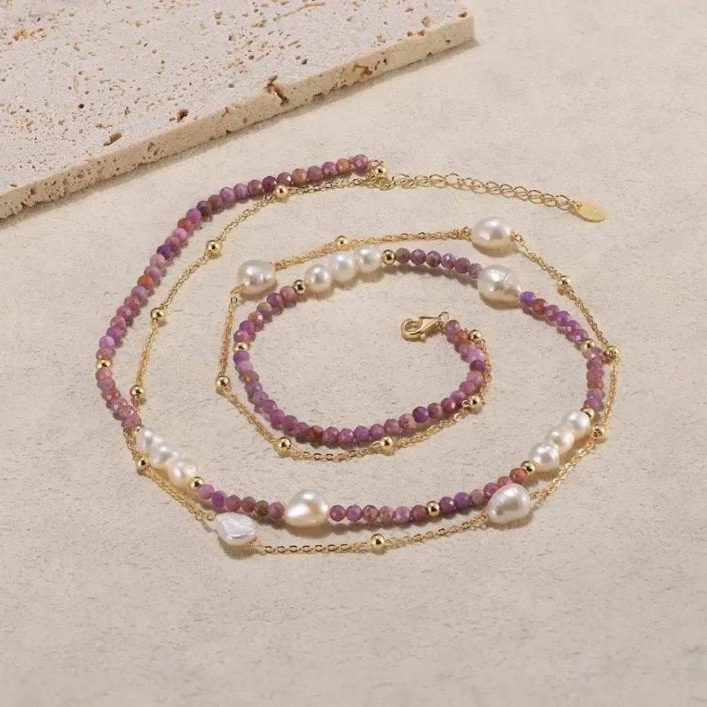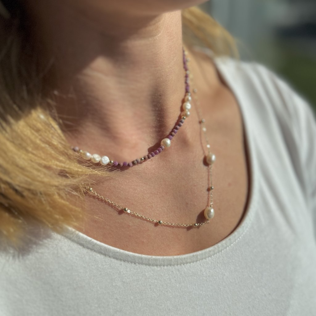 Dlhšia časť retiazky je pozlátená a zdobená zlatými korálkami a perlami, čo vytvára krásny kontrast s kratšou časťou. Je osadený fialovým lepidolitom, perlami a pozlátenými korálkami, ktoré šperku dodávajú hĺbku a charakter.
