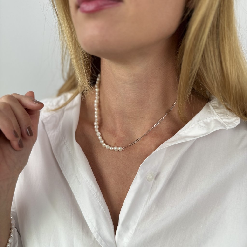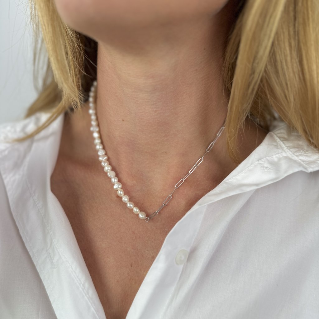 Predstavujeme striebornú retiazku MARGIT - dokonalé spojenie elegancie a moderného dizajnu. Tento jedinečný šperk má originálny dizajn, kde polovicu retiazky zdobia pôvabné 6 mm široké perly, zatiaľ čo druhá polovica zostáva klasickou retiazkou.