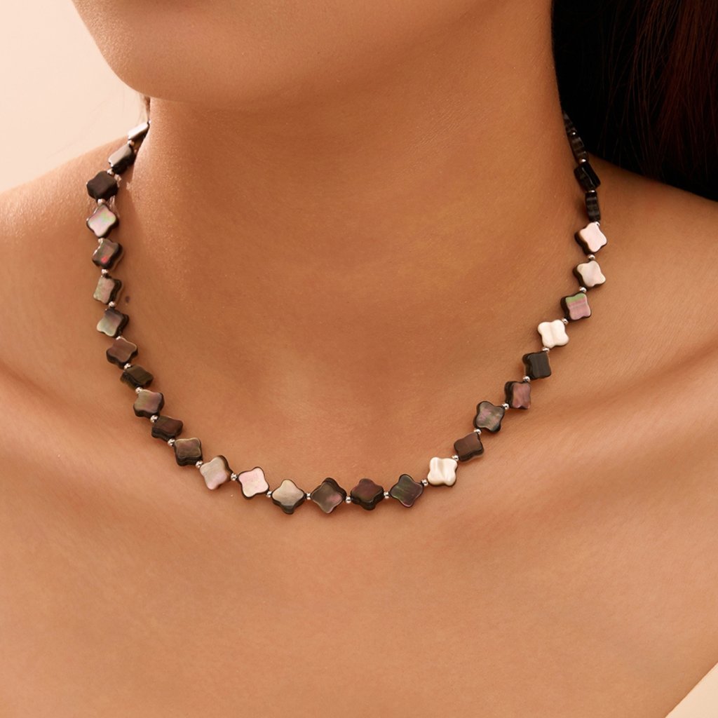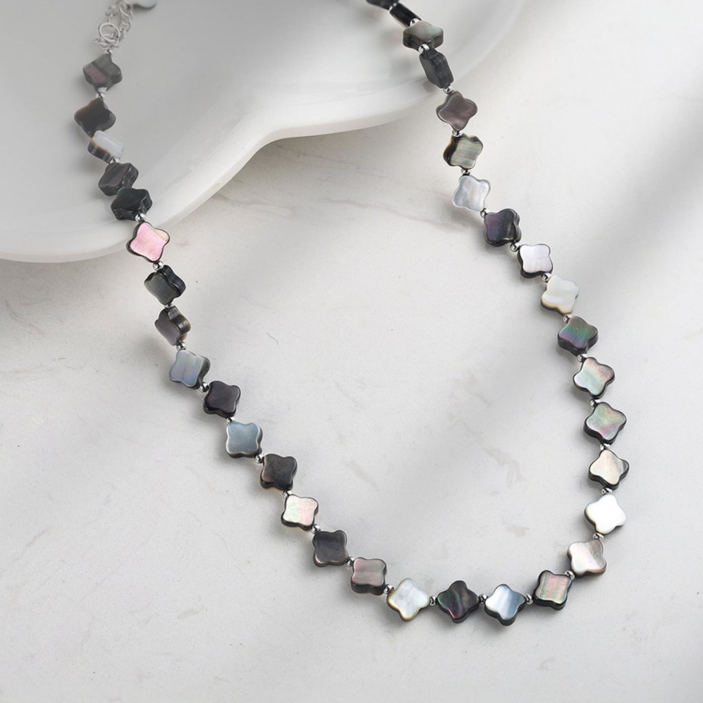 Náhrdelník je zdobený syntetickými perlami v perleťových a čiernych odtieňoch, ktoré vytvárajú moderný a pritom jemný kontrast. Nastaviteľná dĺžka retiazky 40 + 5 cm umožňuje pohodlné nosenie a prispôsobenie rôznym typom výstrihov. Rozmer prívesku je 8 × 8 mm a šírka retiazky činí 2 mm, vďaka čomu pôsobí šperk veľmi jemne a decentne.