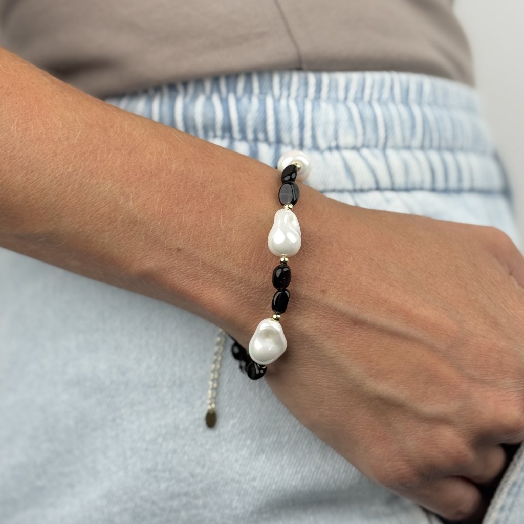 Pozlátený strieborný náramok s perlami BLAKE je šperkom, ktorý dokonale spája eleganciu, jemnosť a duchovný význam. Je zdobený sladkovodnými perlami, symbolmi čistoty a harmónie, a obsidiánom, ktorý chráni pred negatívnou energiou a posilňuje sebavedomie. Kombinácia zlatej farby, perleťových tónov a čiernych detailov vytvára sofistikovaný a pútavý dizajn.